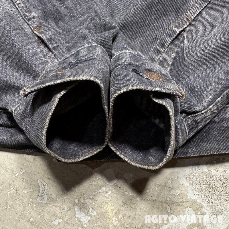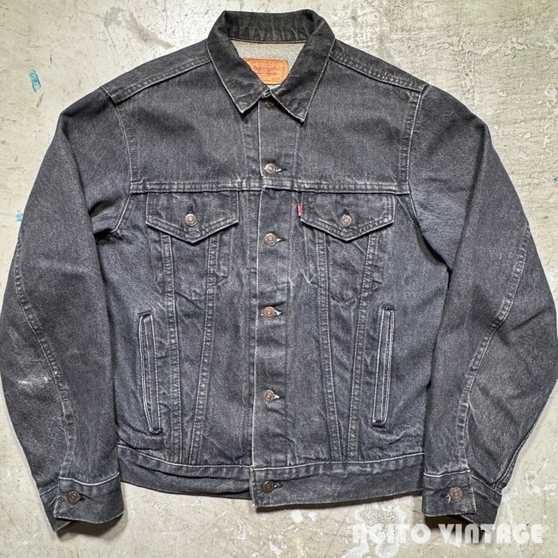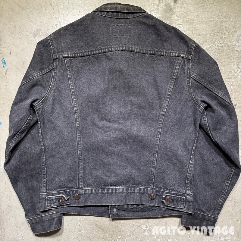 80年代後頃のLevi's 70506-0259ブラックデニムジャケットです。ボタン裏無刻印。70505の後継モデルでスラッシュポケットが付くモデルです。86年製造ですのでこの品番が付く初期の頃のモデルだと思われます。全体的に使用感があり襟に汚れや色落ちが見られます。右袖の生地に一部ダメージがございます(貫通はしきっていません)。袖先や裾に角擦れも見られますが、コンディションは良好かと思います。サイズは40R表記で、標準体型の方にお勧めしたいサイズ感です。ここ数年でブラックデニムの需要が非常に高くなり見かける頻度も少なくなってきたように思います。お探しだった方はこの機会をお見逃しなく。春先のおでかけのお共に是非。