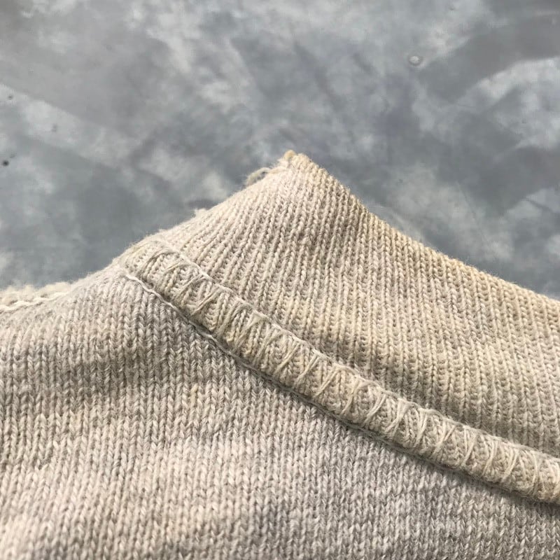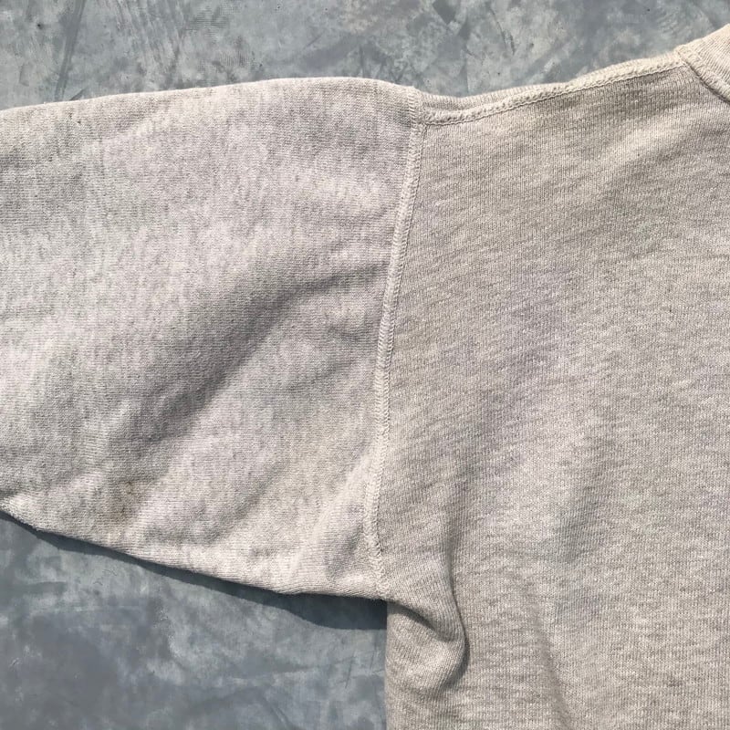 50's頃のヴィンテージスウェットトレーナーです。4本針で縫われたはめ込み型のガゼット(前V)や、セットインスリーブと呼ばれる袖の縫い付け(肩から脇に向かって垂直)等当時のディティールが見受けられます。ガゼットの形も少し大きめで、どこかアジのある前Vとなります。首元にうっすらと汚れはございますが、特筆するダメージも無く非常に綺麗なヴィンテージアイテムです。着丈は短く身幅は広くなっています。シンプルなグレーのスウェットは永遠の定番アイテムといえますので、1枚あると非常に重宝します。