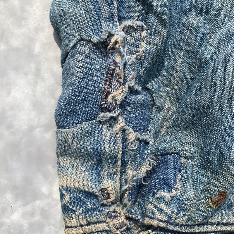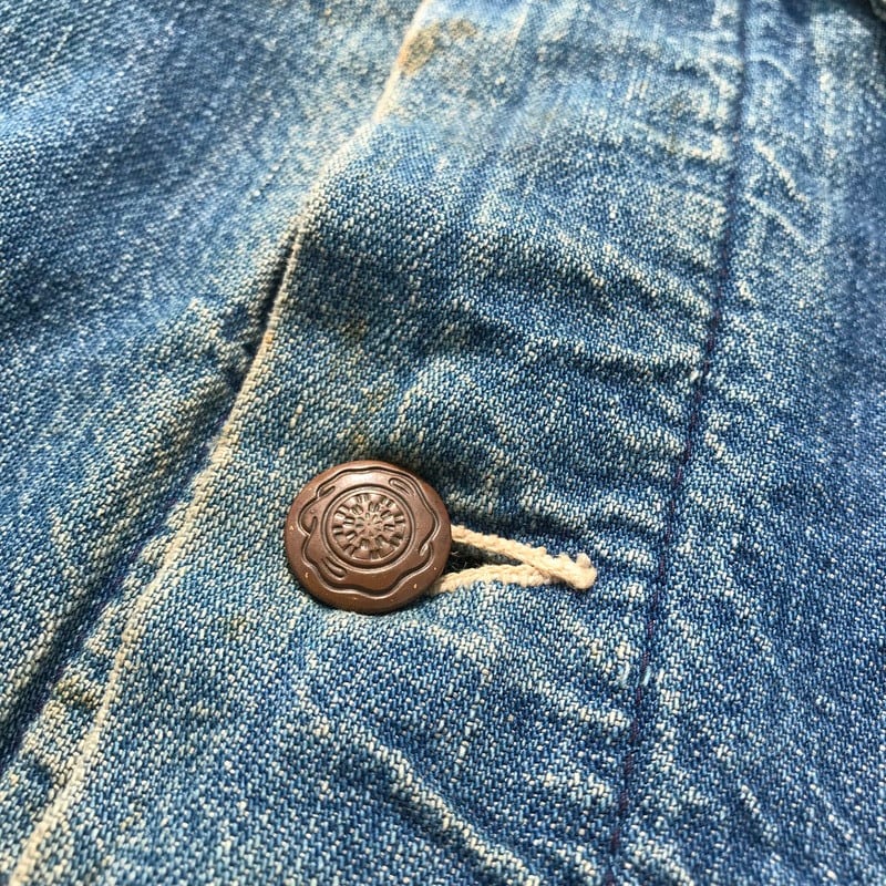 60s頃のデニムカバーオールです。ブランド表記はございませんが、タグやディティールからラングラーのBLUE BELLブランドと思われます。全体のフェード感も雰囲気が良く希少な38サイズですので、男女共に着やすいサイズ感です。袖周りやポケット、内側のアームホール周りのブランケット地にダメージがございます。雰囲気重視の方にはおススメです。