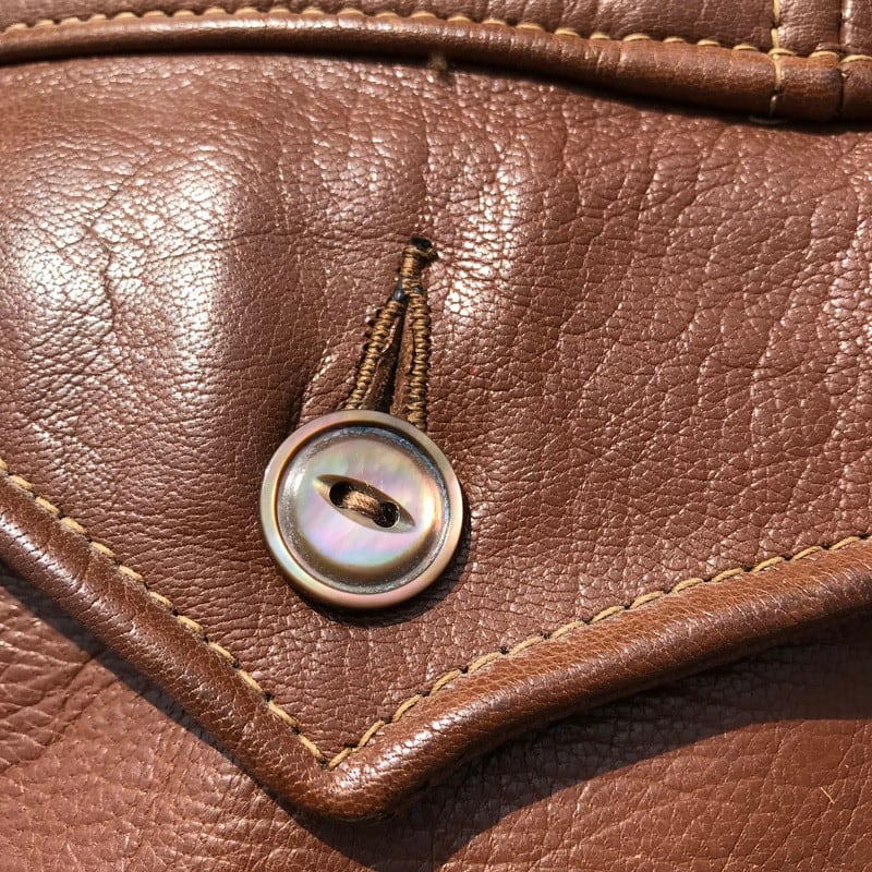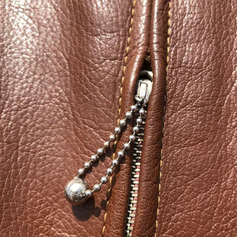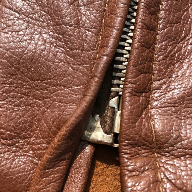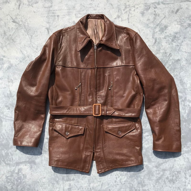 30~40年代頃のレザーカーコートです。Jack Frost社のタグが内側にございます。レザーの状態も非常に良く年代特有の劣化等もございません。扇型のTALONジッパーを使用し、コの字留めと呼ばれるジップエンドが付いていたと思われ、ジッパーの一番はハトメが内側に隠れている隠れハトメと呼ばれる珍しいタイプです。胸元のボールチェーンの欠損も無くGOODコンディションですので、コレクター必見です。