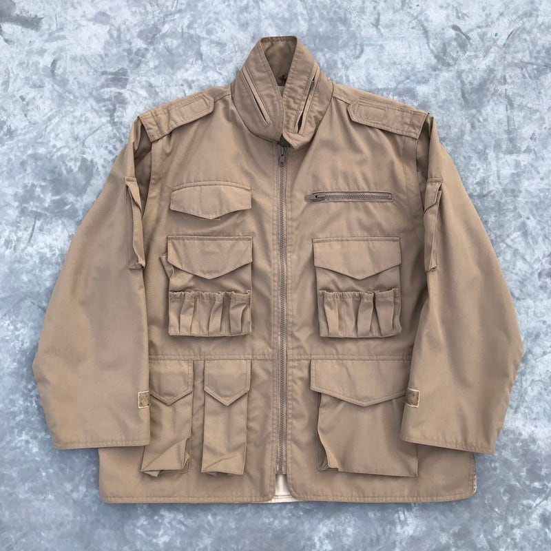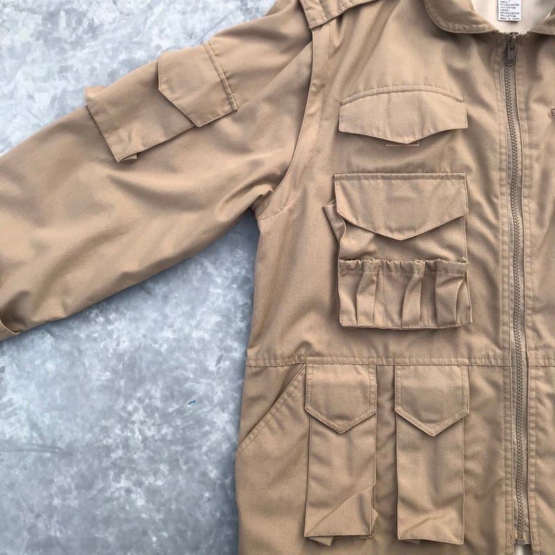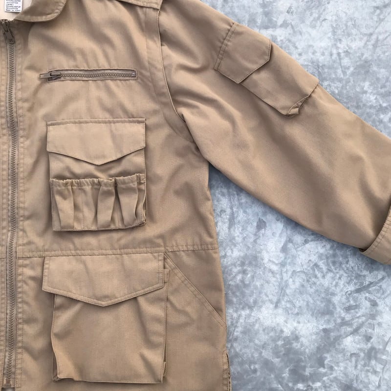 80~90年代頃のEarly Winters フォトグラファージャケットです。その名の通りフォトグラファー(カメラマン)用のジャケットで、フィルム用等たくさんのポケットが特徴です。両袖は着脱可能でベストとしても着用出来ます。フ首元のジップの中のフードは切り取られていて欠損しています。背中に3脚を入れるポケットが非常に興味深い1着です。汚れやダメージも無くGOODコンディションです。