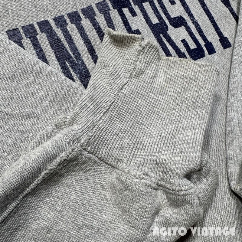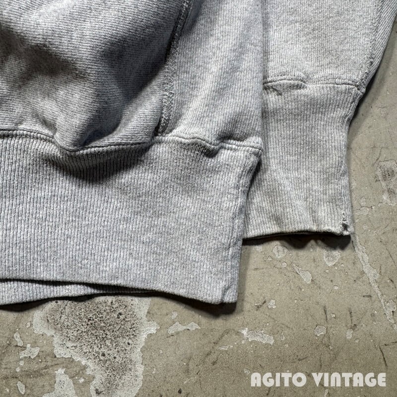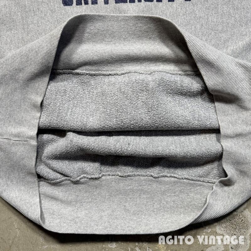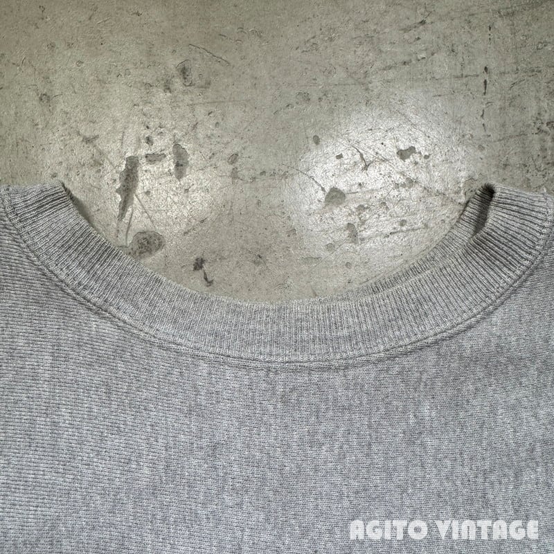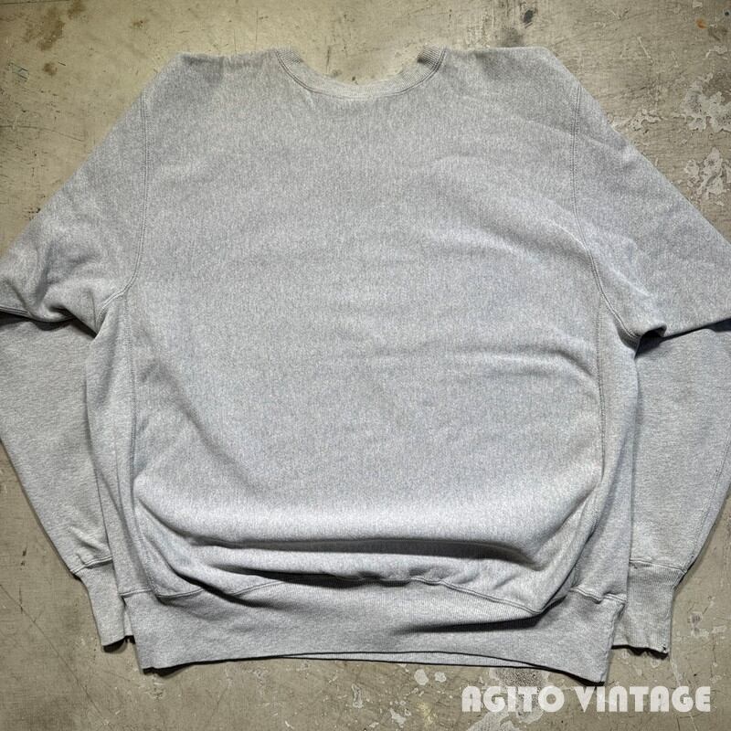 90年代のCampionリバースウィーブスウェットです。刺繍タグが付くメキシコ製で、こちらはコットン/ポリエステルボディです。フロントにWESTERN ILLINOIS UNIVERSITYのプリントが入ります。一見一般的な杢グレーの個体に見えますが、裏地もグレーという少し珍しい仕様です。少し前にも同じボディのリバースをご紹介しましたが、ノーマルのグレーボディーに比べると見かける機会は少ないのかなと思います。プリントに擦れがあり、首リブや袖リブに薄汚れがございます。袖先に小さなダメージがございます。その他使用感はございますが、大きなダメージは無くコンディションは良好かと思います。XX-LARGE表記でゆったりとした大き目サイズです。大きいサイズをお探しだった方は是非この機会にいかがでしょうか。
