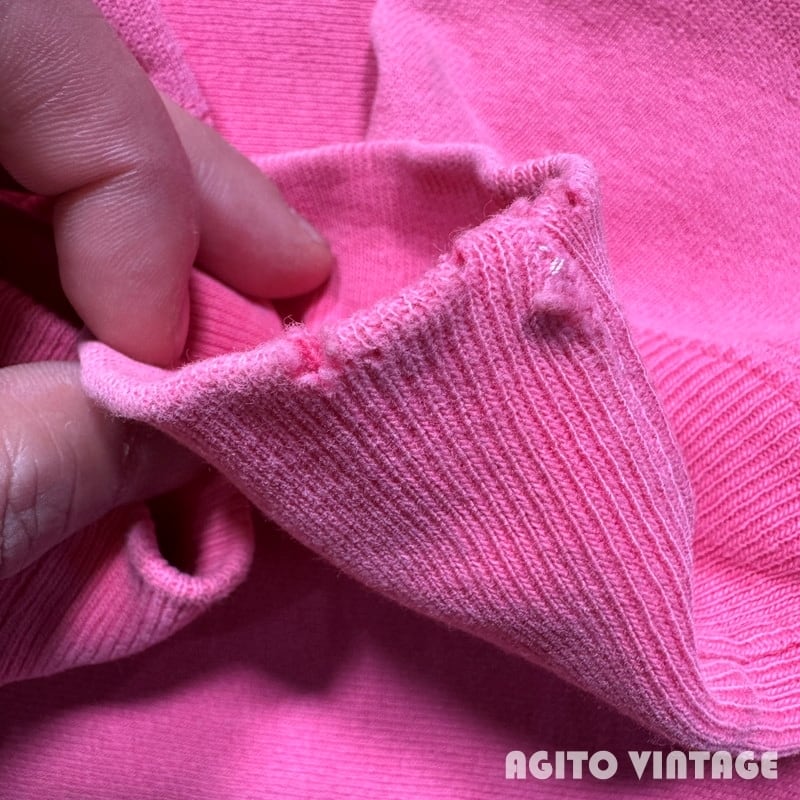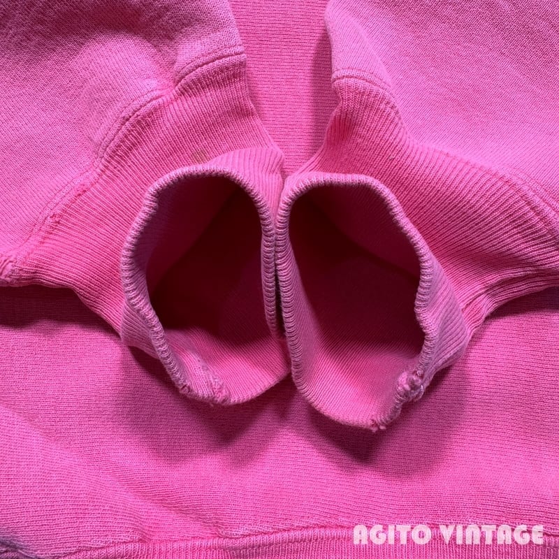90年代のChampionリバースウィーブスウェットです。USA製の刺繍タグが付くコットン/ポリエステルボディの1着です。1934年に誕生したリバースウィーブは現在もそのデザインはほとんど変わることなく非常に人気の高いアイテムとなっています。ご紹介するこちらは目付きと呼ばれるブランドアイコンの目玉が刺繍されたモデルで、綺麗なピンクカラーの個体です。首リブや袖リブに小さなダメージがいくつかございます。右の袖リブには白っぽい汚れ1箇所とシミが3箇所ございます。全体的にやや色あせなどの使用感がございますが、コンディションは悪くないと思います。LARGE表記で程よいゆったりサイズです。デニムジャケットのインナーに合わせても綺麗なのでオススメです。お花見のお共にいかがでしょうか。