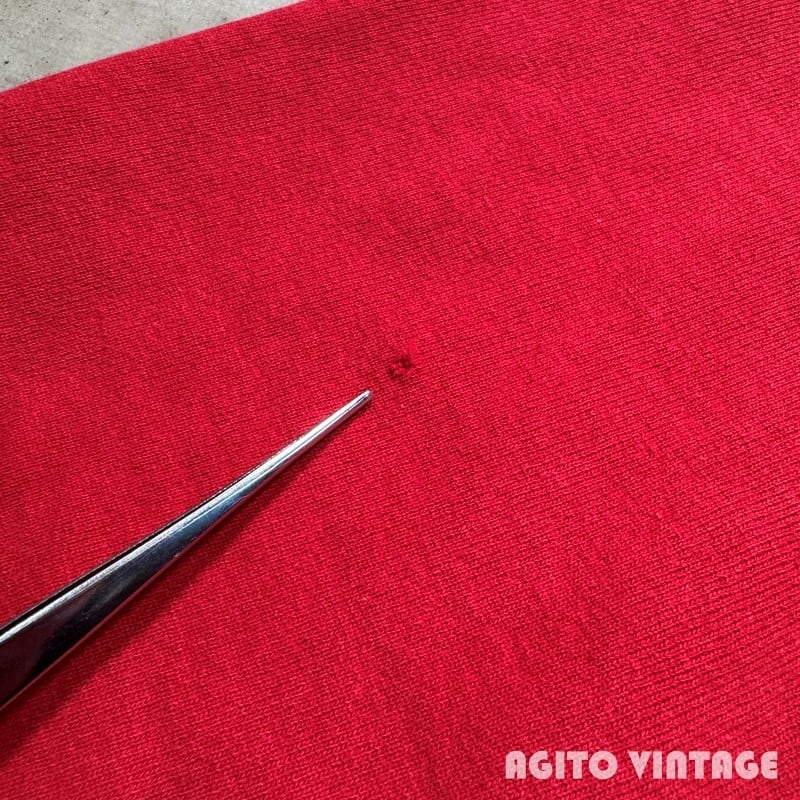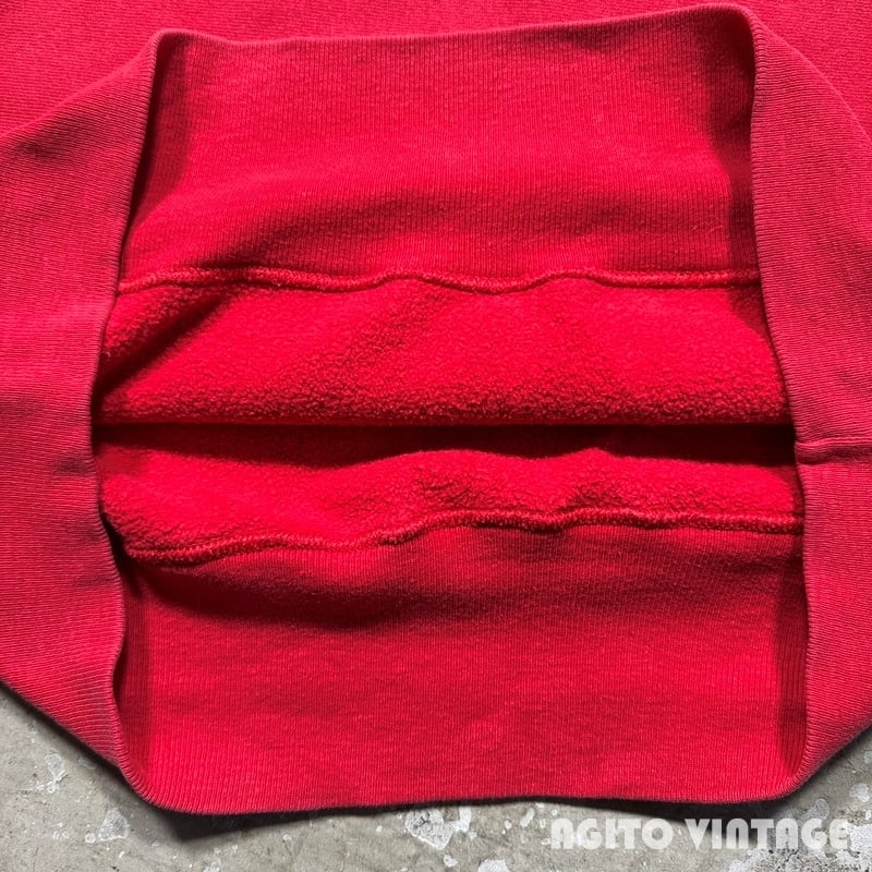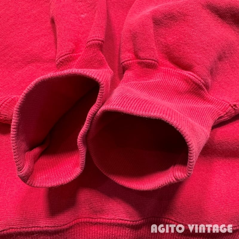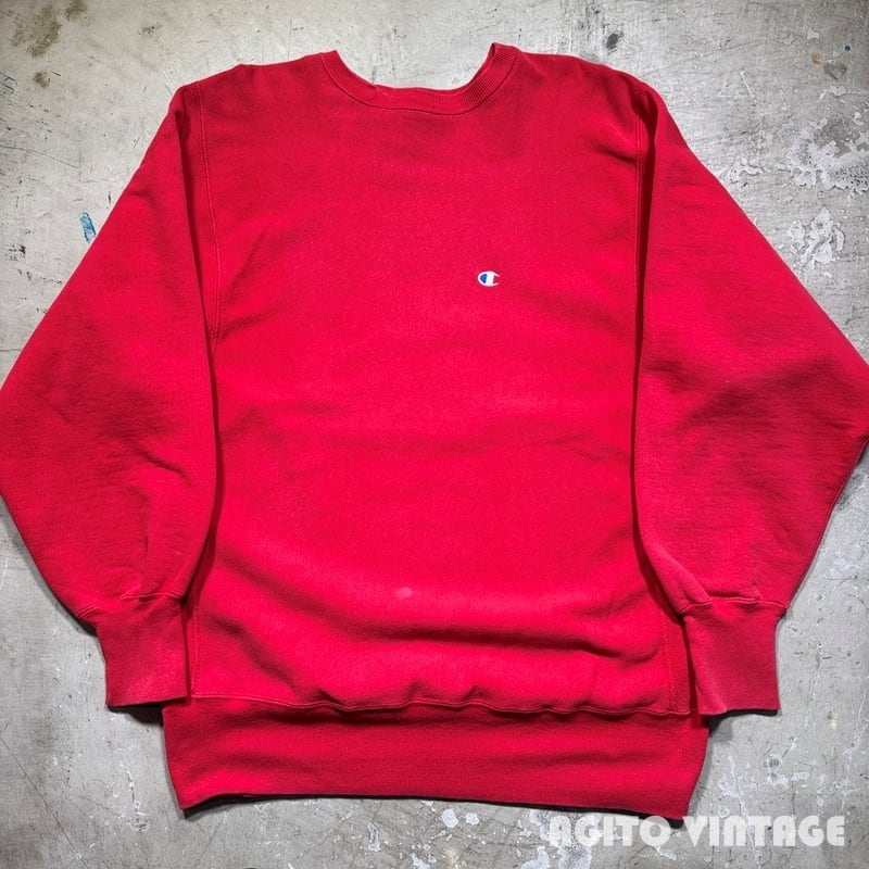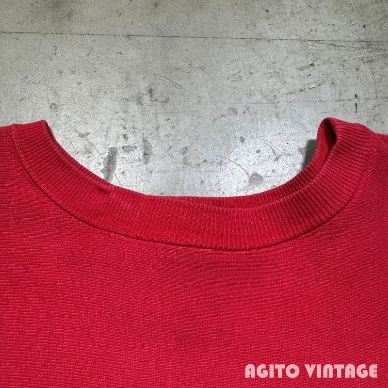 90年代のChampionリバースウィーブスウェットです。USA製の刺繍タグが付くコットン/ポリエステルボディの1着です。1934年に誕生したリバースウィーブは現在もそのデザインはほとんど変わることなく非常に人気の高いアイテムとなっています。ご紹介するこちらは目付きと呼ばれるブランドアイコンの目玉が刺繍されたモデルで、全体的にやや褪色したレッドの個体です。両袖に小さなダメージが1箇所づつございます。腹部に白い薄汚れがございます。その他使用感はございますが、比較的コンディションは良好かと思います。X-LARGE表記で程よいゆったりサイズです。レッドカラーは経年変化も楽しめると思いますのでガンガン着倒してみてはいかがでしょうか。
