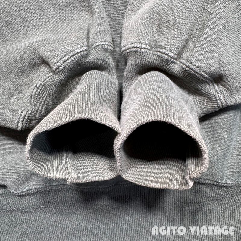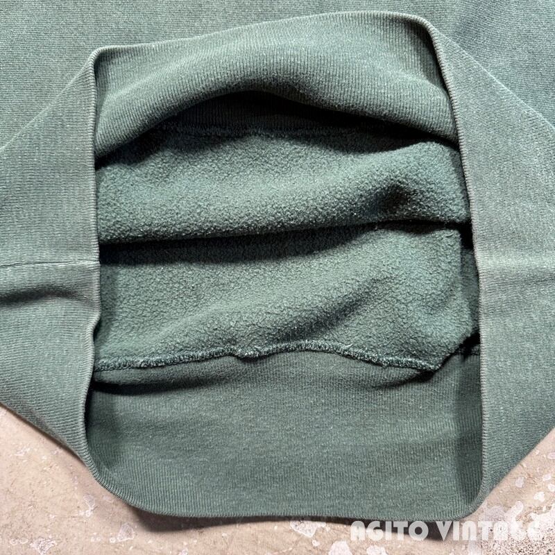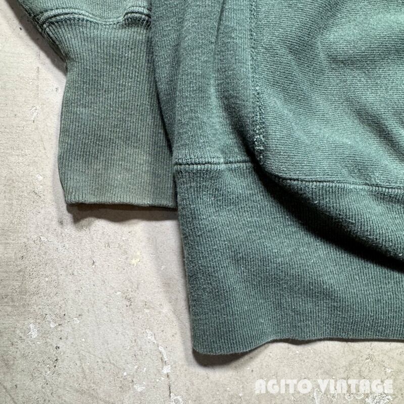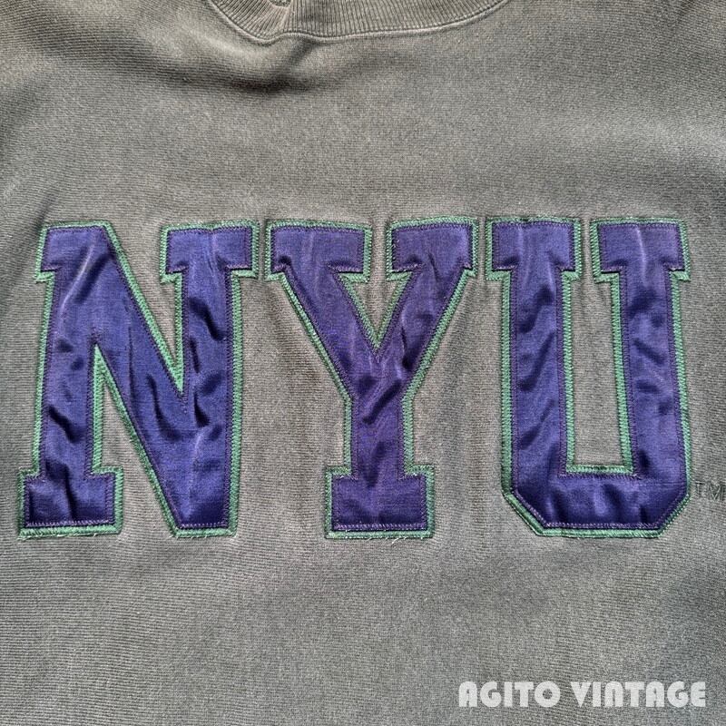 90年代のChampionリバースウィーブスウェットです。USA製の刺繍タグが付くコットン/ポリエステルボディの1着です。ご紹介するこちらは、リバースの中でも人気の高いグリーンカラーで、胸元にはNYU(NEW YORK UNIVERSITYと思われる)の文字が縫い付けられています。全体的に色褪せ等の使用感はございますが、ダメージは無く小さな薄汚れ以外は比較的コンディションの良い個体だと思います。LARGE表記で程よくゆったりとしたサイズ感です。グリーンカラーも経年変化が楽しめるのでガンガン着倒してみてはいかがでしょうか。