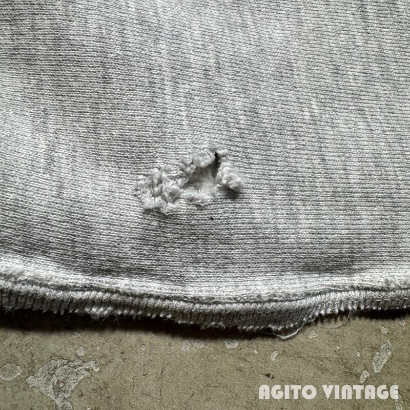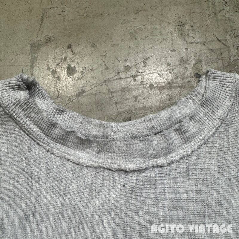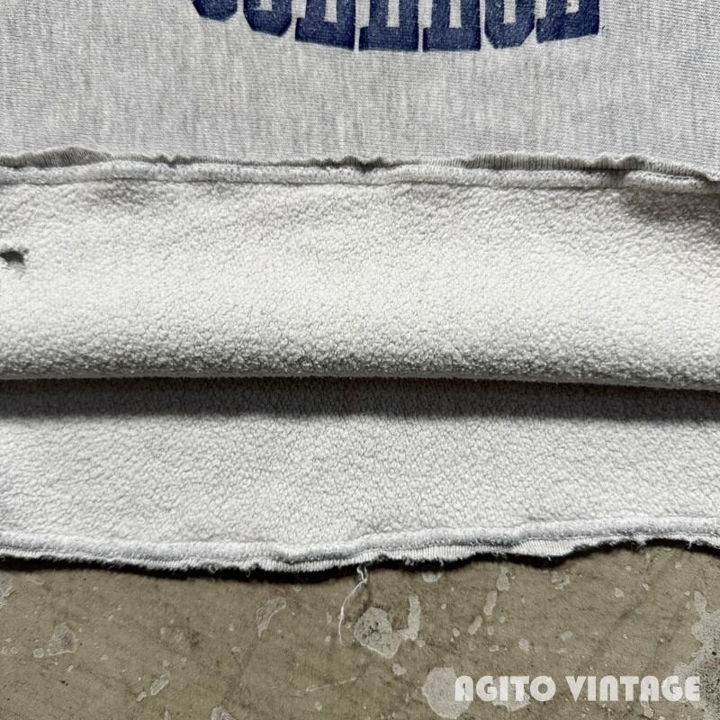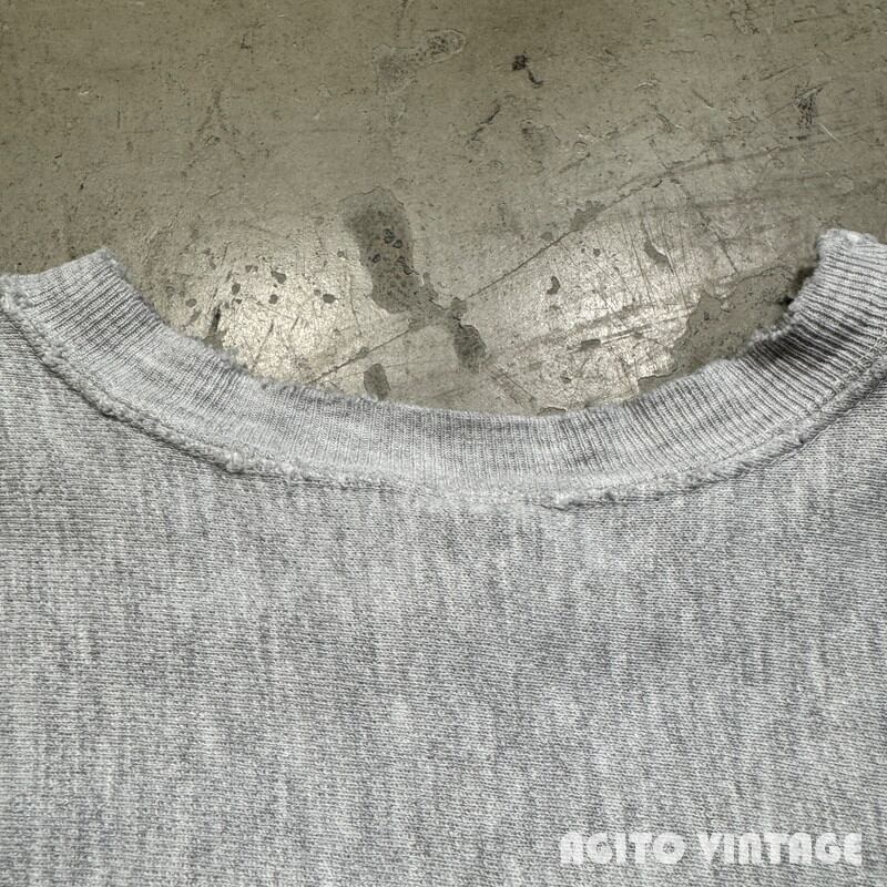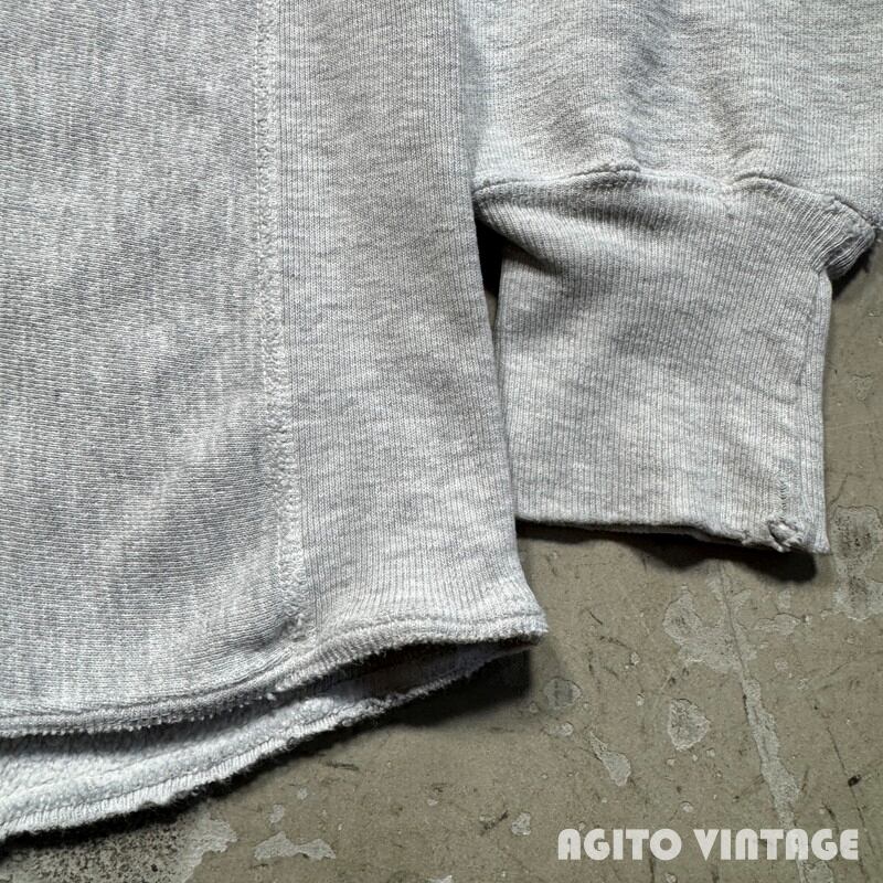 90年代のChampionリバースウィーブスウェットです。USA製の刺繍タグがつくコットン/ポリエステル/レーヨンボディーの1着です。フロントにGETTYSBURG COLLEGEのプリントが3段で入ります。首リブや袖リブ、フロントなどにいくつかダメージがございます。裾リブは縫い目下からカットオフされています。プリントにはクラックが見られます。全体的に使用感がございます。X-LARGE表記で身幅にゆとりがあり、裾リブがカットされたことによりボックスシルエットとなっていますので、ワイド目なパンツと合わせてもウエスト周りのもたつきは無くインナーとのレイヤードも楽しめます。個人的には気負わずラフに合わせる事ができるのでお勧めです。