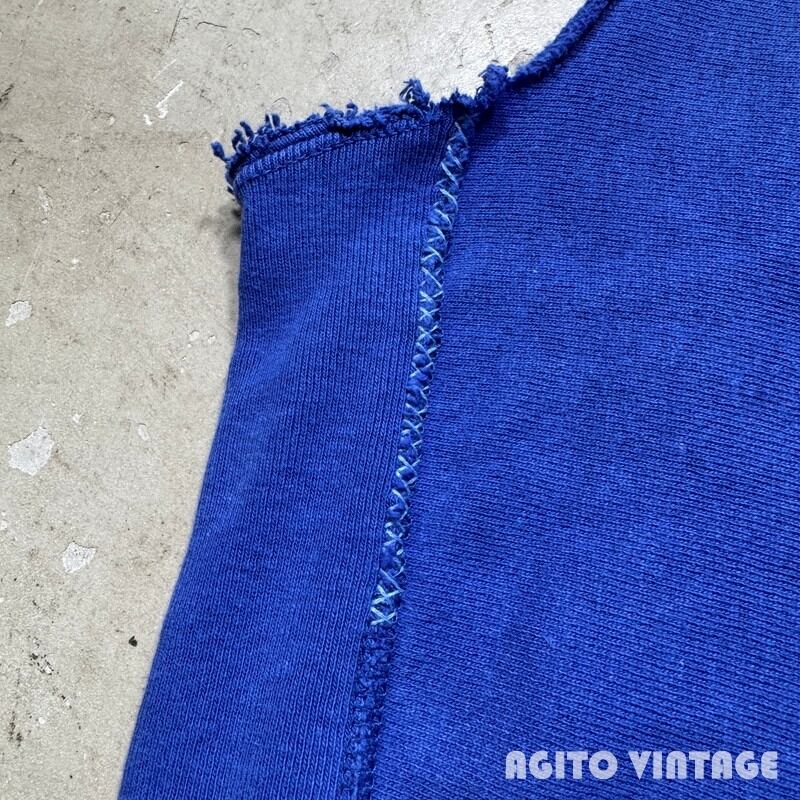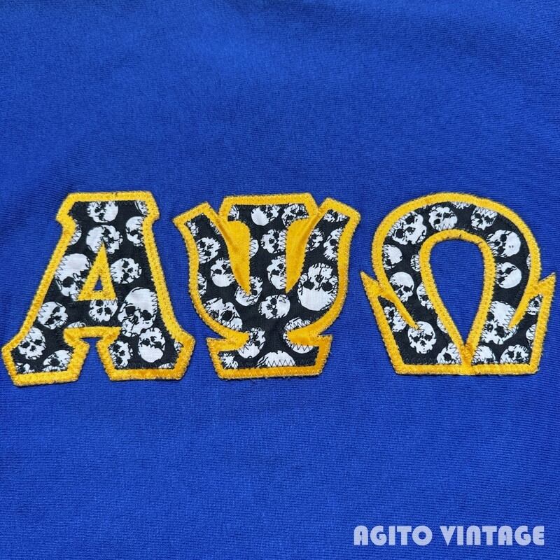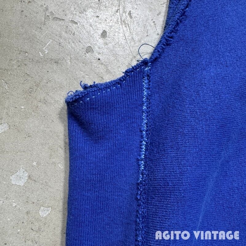 90年代のChampionリバースウィーブスウェットです。USA製の刺繍タグがつくコットン/ポリエステルボディーの1着です。フロントにはAψΩの文字が縫い付けられており、どこかのフラタニティ関連だと思われます。両袖が縫い目の所から綺麗にカットオフされています(袖側の生地が少し残っています)。同じサイズ感のリバースウィーブならドッキングしてカスタムも出来ると思います。脇下に補修跡が左右にございます。X-LARGE表記で身幅にゆとりがありますのでシャツなどとのレイヤードもし易いかと思います。フラタニティのワッペンにドクロ柄が使用されているのも珍しいのではないでしょうか。カスタム等がお好きな方は是非この機会にいかがでしょうか。
