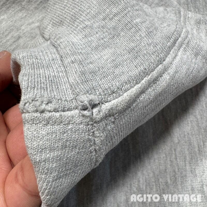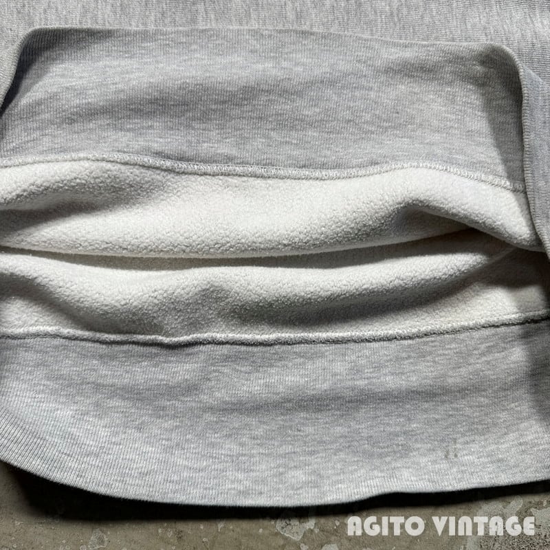 80年代のChampionリバースウィーブスウェットです。USA製のトリコタグがつくコットン/アクリル/レーヨンボディーの1着です。フロントにはPENNの文字がプリントされておりペンシルバニア大学の物と思われます。首リブ周りと袖リブ周りに細かなダメージがいくつか見られます。裾リブにも小さな擦れ等ございますが、目立つ汚れ等は無く総合的なコンディションは良好かと思います。X-LARGE表記でゆったりとしています。袖のリブは伸びてしまったのかきゅっと絞った感じでは無く緩めです。PENN UNIVのプリントもリバースでは非常にメジャーで人気もありますし、プリントの歪み具合も味があってオススメです。お好きな方は是非この機会にいかがでしょうか。