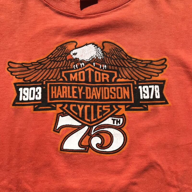 70’s HARLEY DAVIDSON Tシャツ イーグル Collegiate Pacificボディ オレンジ ヴィンテージ 75周年 希少 Sサイズ USA