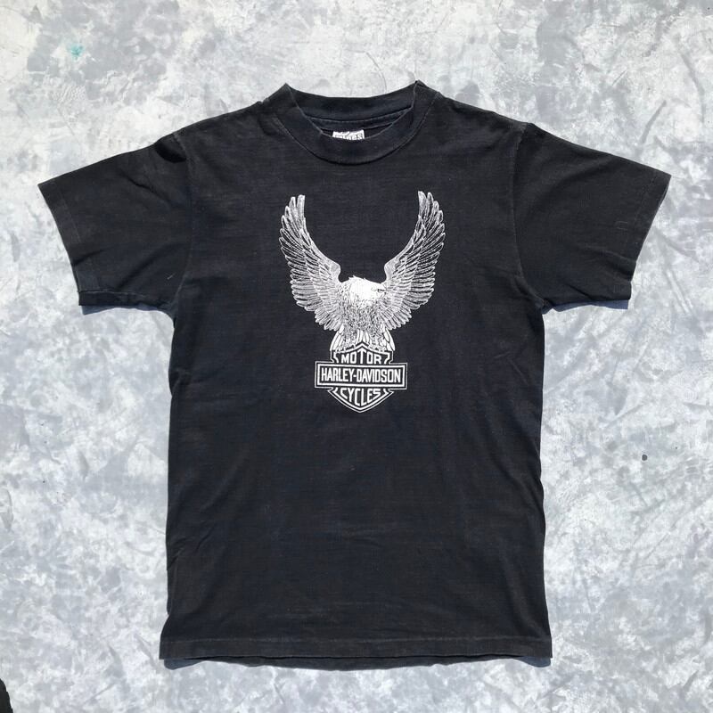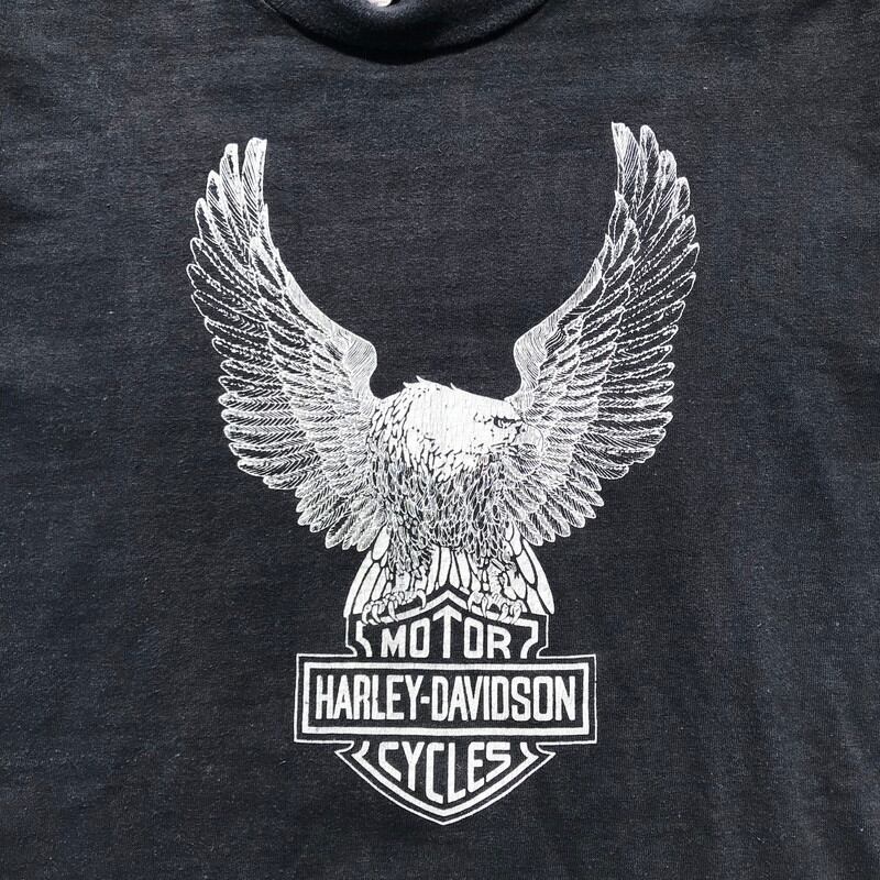 80'sのHARLEY DAVIDSONイーグルTシャツです。ブラックにホワイトのイーグル、背面にはホイールショップのデザインがかっこいい1着です。全体に色褪せがございますが、ダメージなども無く美品と言える商品です。サイズもMサイズですので、女性にもおススメです。バイカー必見です!