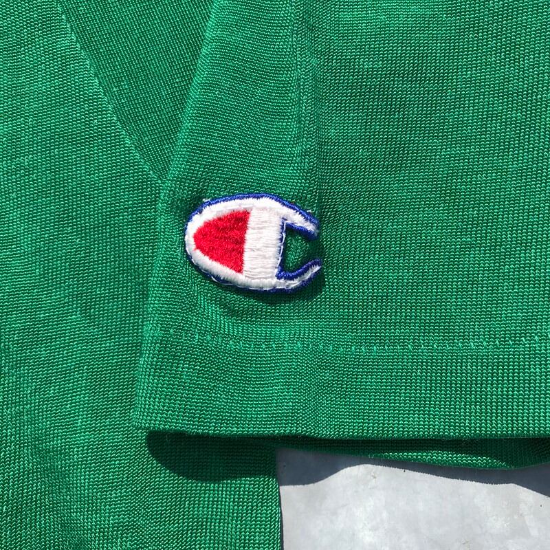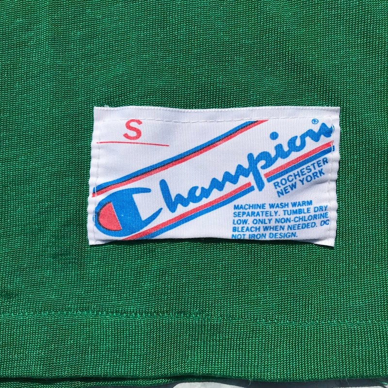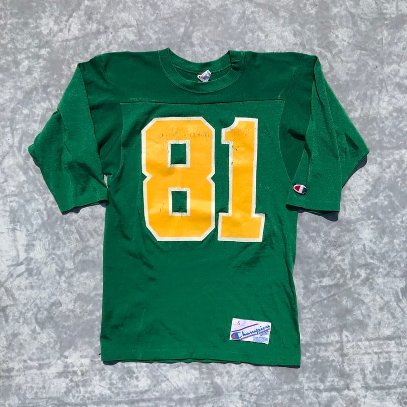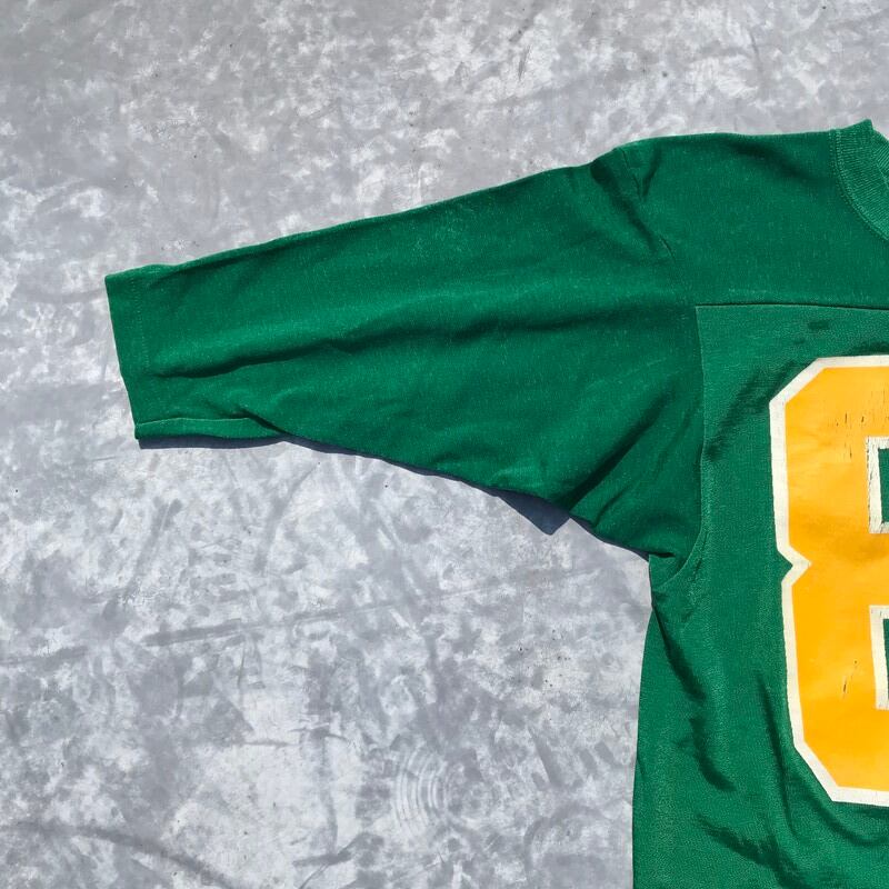 80~90's頃のChampionフットボールTeeです。トリコタグのグリーンボディにイエローナンバーがオレゴンカラーを彷彿させます。ラバー割れはありますが雰囲気抜群です。コットンナイロンフットボールシャツ独特の毛羽立ちも少なく綺麗です。サイズもあまり見かけないSサイズですので女性でも着やすいサイズ感です。