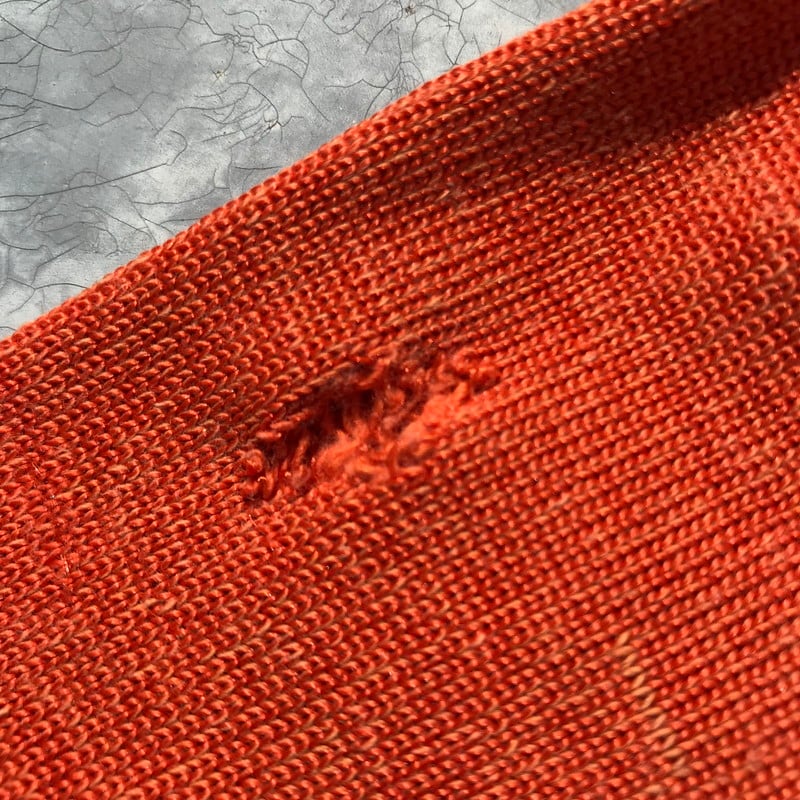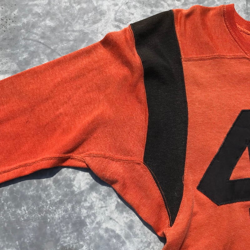 50’s頃のBadger Sporting Goods Coのレーヨンフットボールシャツです。あまり出てこないオレンジブラックの配色がGOOD。肩と袖の切り替えしや、脇ガゼットなどのディティールも雰囲気があります。ナンバリングはワッペンタイプです。使用感や若干の撚れがあり、右肩に破れがあります。なかなか希少なアイテムですので、コレクター必見です。