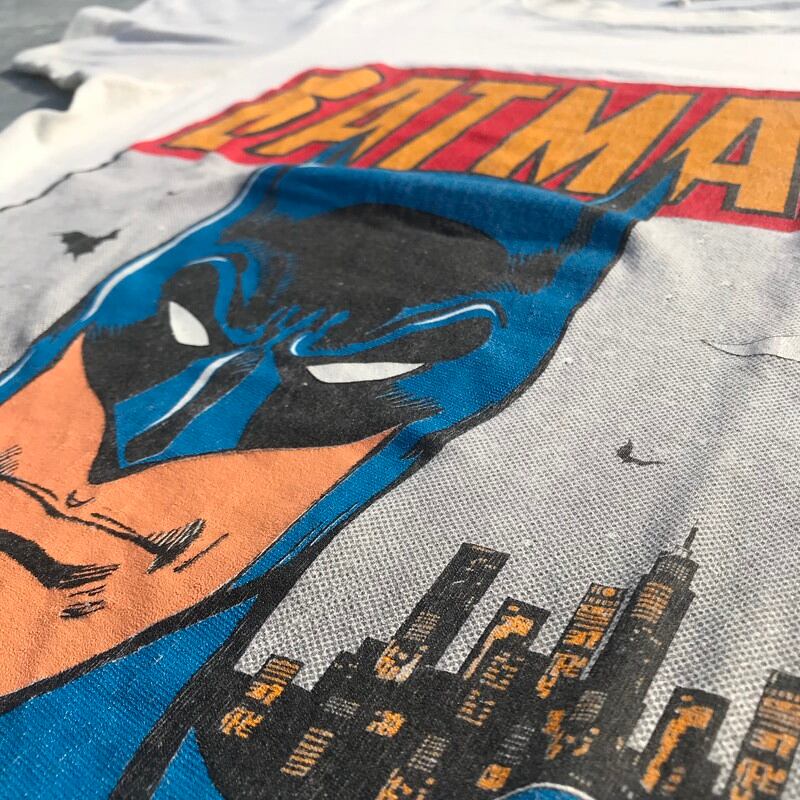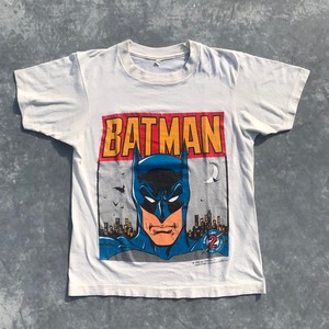 80's後半のBATMAN Tシャツです。DCコミックのメインキャラクターのバットマンがフロントにプリントされておりインパクト抜群です。ボディーはオフホワイトと、薄いイエローの中間のような淡い色をしています。タグが損傷しているので、印字は消えていますが、おそらくコットン100%。サイズはMくらいです。