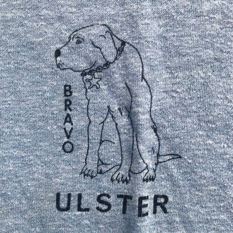 80's頃のChampion チャンピオンリンガーTシャツです。ブルーの霜降ボディが涼し気です。胸元の犬プリントがとても良いアジ出してます。ULSTERとはアイルランド島北部の地方名称だそうです。アルスター最高といった意味でしょうか。