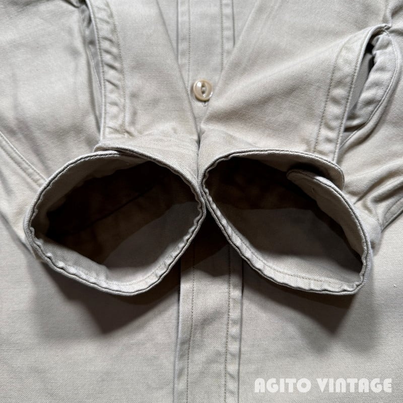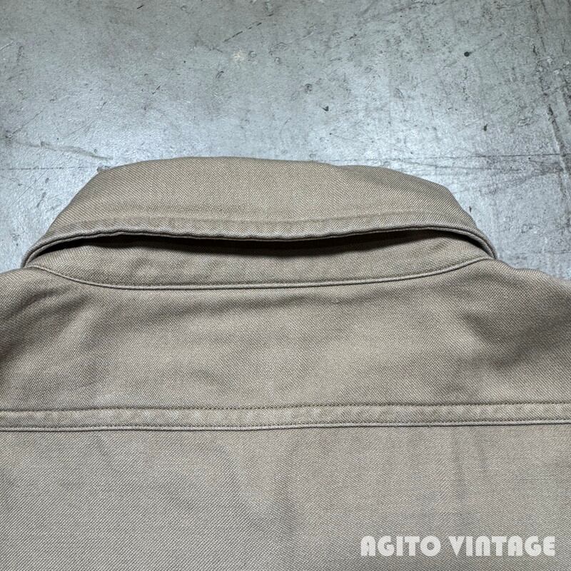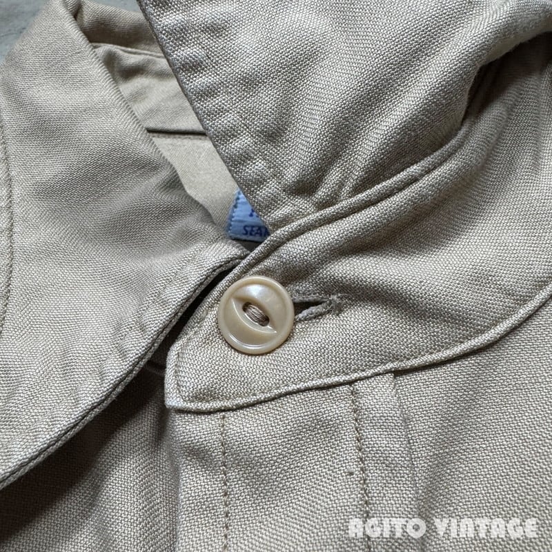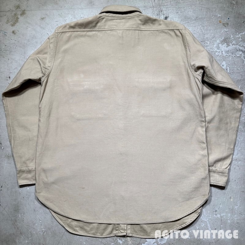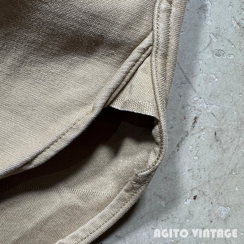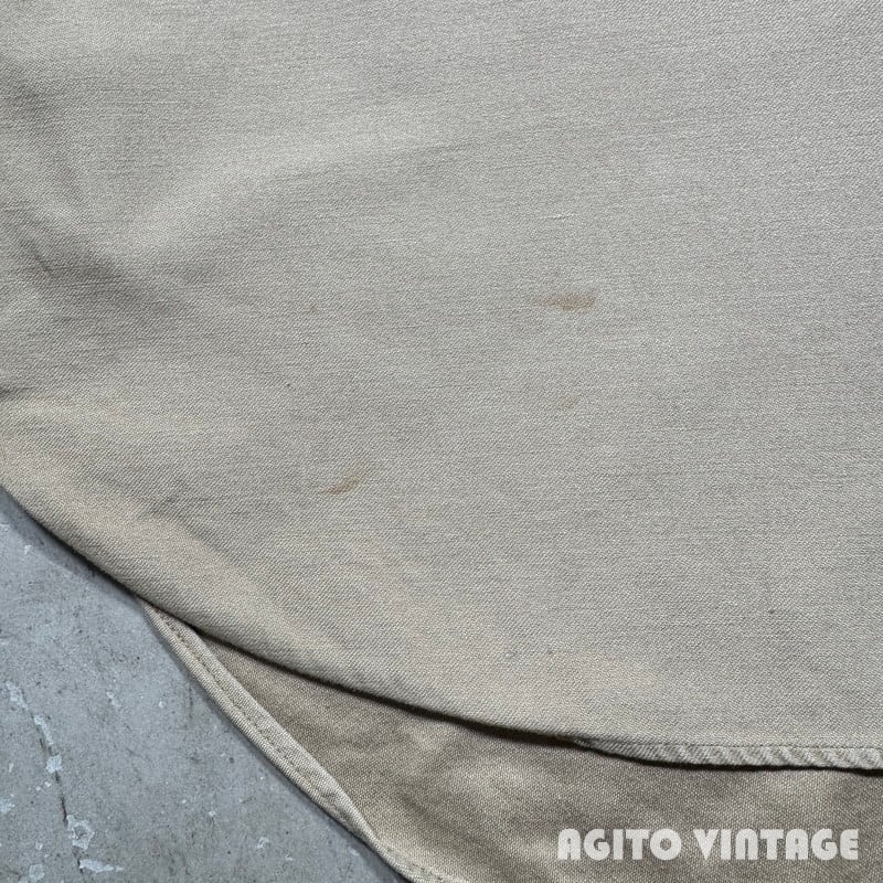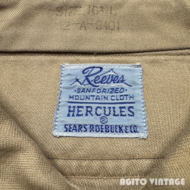 50年代頃のHERCULES ワークシャツです。HERCULESはアメリカ3大ストアで知られるSearsがワークウェアを展開していたプライベートブランドです。こちらのアイテムはReeves社のMOUNTAIN CLOTHと呼ばれるU.S.ARMYの山岳部隊の為に作られた丈夫な生地が使用されています。チノのように見えますが、ツイルでは無くベイカーパンツのバックサテンの様な生地です。台襟、サイドマチ付き、猫目ボタンとヴィンテージワークウェアらしいディティールです。若干の色褪せや薄汚れはございますが、ダメージは無くコンディションは良好です。Lサイズ表記で程よくゆとりのあるサイズ感です。古いワークスタイルがお好きな方は是非この機会にいかがでしょうか。