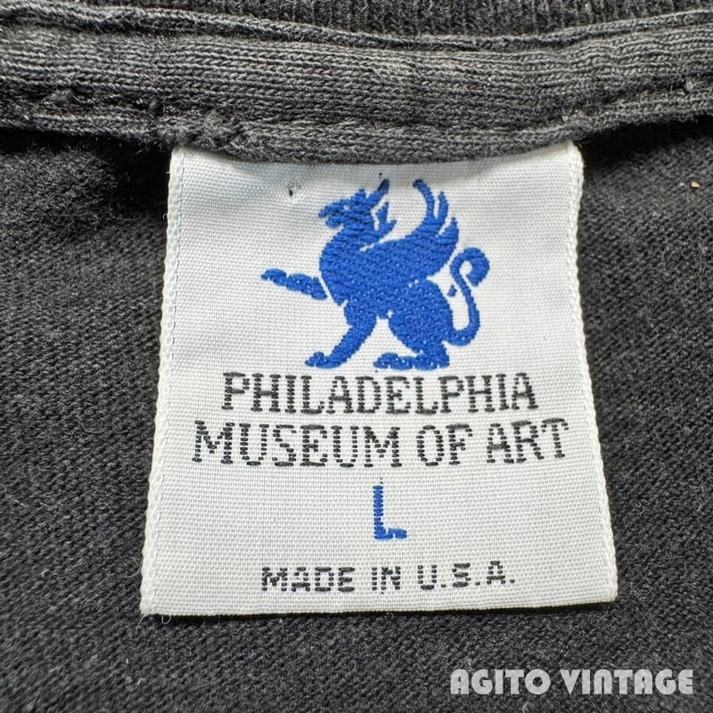 90年代から00年頃のPHILADELPHIA MUSEUM OF ART(フィラデルフィア美術館)で販売されたアートTeeです。ご紹介するこちらは1896年4月に創刊されたドイツの風刺雑誌「Simplicissimus」で最初に使われたアートポスターで作者はトーマツ・テオドール・ハイネというドイツの芸術家です。鎖を破壊し激しく吠えているブルドッグの姿は、社会や政治に噛みつく風刺を視覚的に表現しているとされています。こちらのTシャツは袖、裾共にダブルステッチで縫製されており、PHILADELPHIA MUSEUM OF ARTのタグが付くUSA製です。全体的にやや褪色しており毛羽立ち等の使用感がございます。目立つ汚れやダメージは特にございません。L表記で着やすいサイズ感だと思います。インパクトのあるデザインですのでシンプルなパンツと合わせてみてはいかがでしょうか。