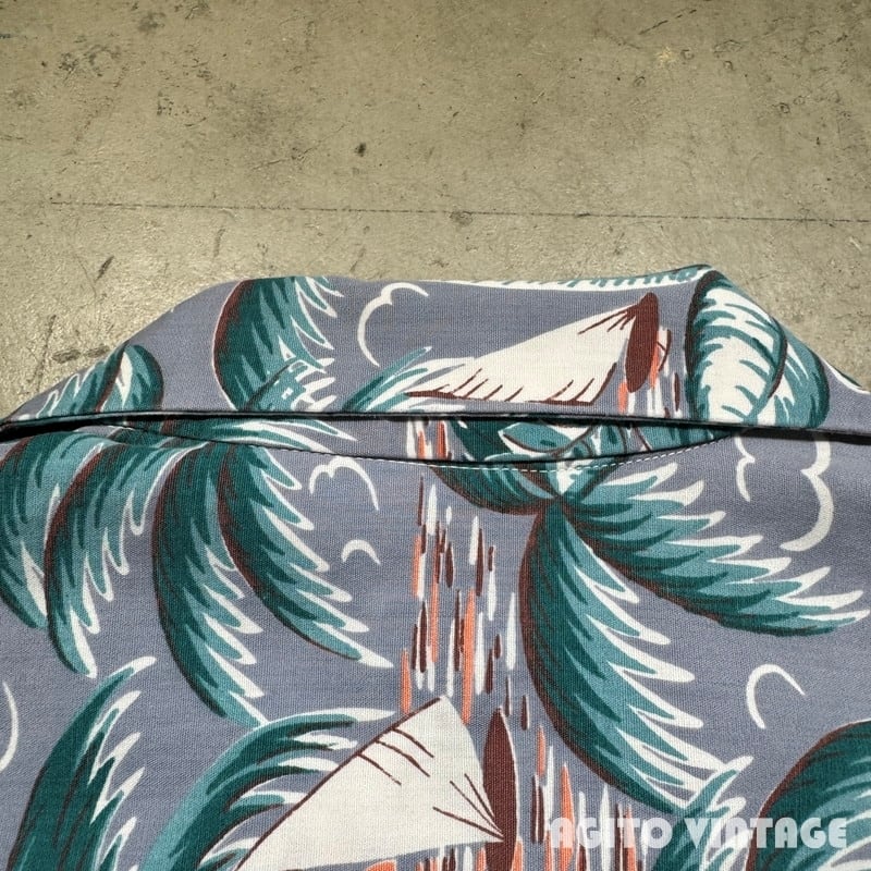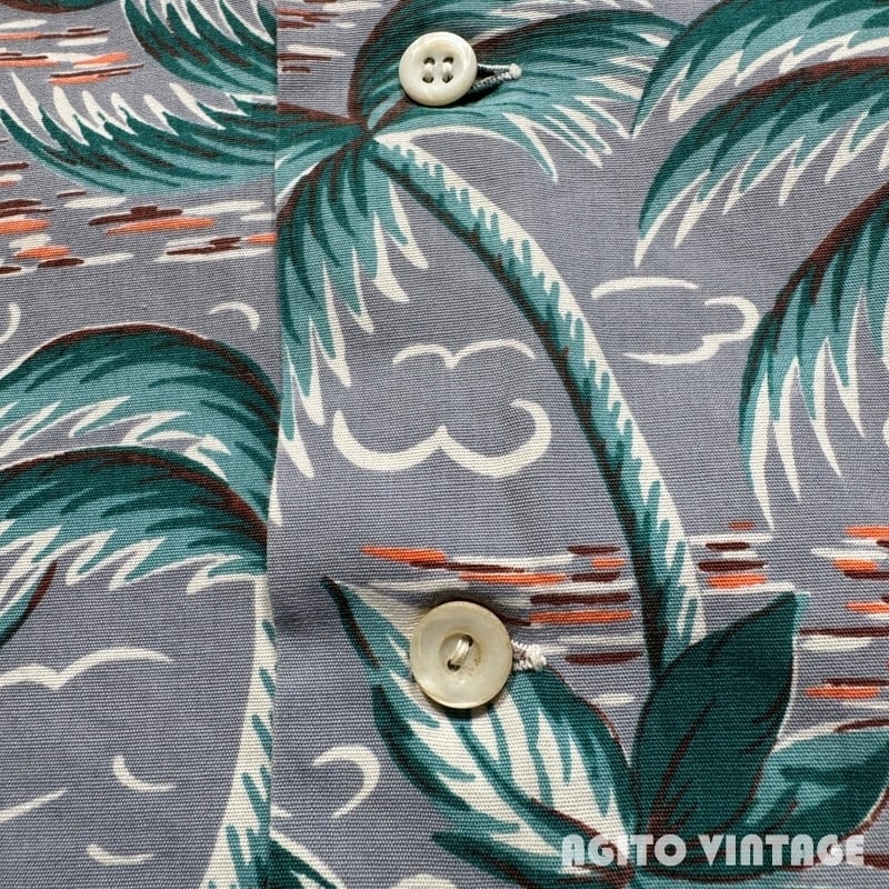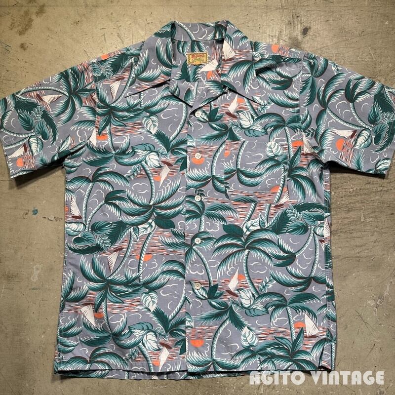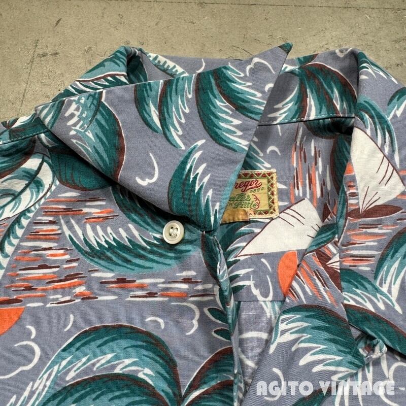 40年代頃のMcGREGOR コットンオープンカラーシャツです。McGREGORは1921年に創業し、100年を越える老舗アメリカンカジュアルブランドです。ご紹介するこちらのアイテムは、1950年代以前に使用されていた筆記体表記のタグが付く個体で、平織のコットン地にパームツリーと夕焼けの海に浮かぶヨットが描かれたデザインです。襟先に長い袋縫いのロングポイントにループボタンの開襟仕様です。一番下のボタンが割れていたので似たサイズのボタンに付け替えています(4穴では無く2穴になっています)。ごくわずかに色褪せがあり、フロント下部に小さなピンホールが1箇所ございます。その他目立つダメージなど無くコンディションは良好です。。MEDIUM表記で需要の高いサイズ感ではないでしょうか。スレートブルーに夕焼けのオレンジ色のバランスが非常に良いのでこのデザインは刺さる方も多いのではないでしょうか。コットン地ですのでお手入れもし易くオススメです。