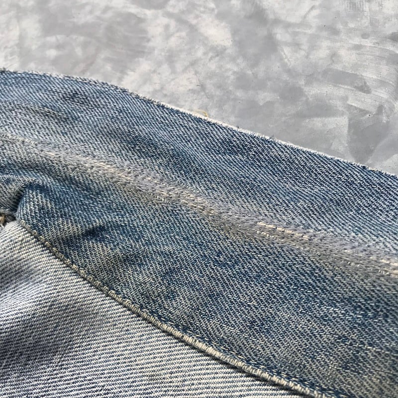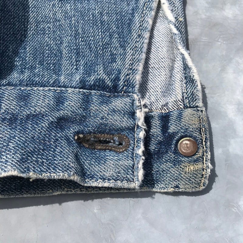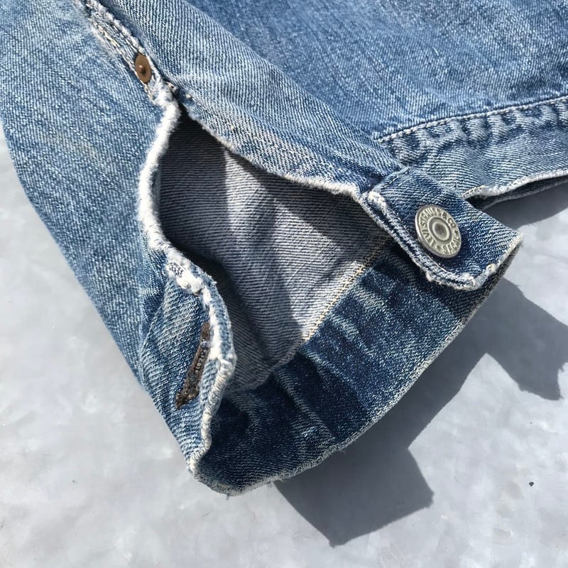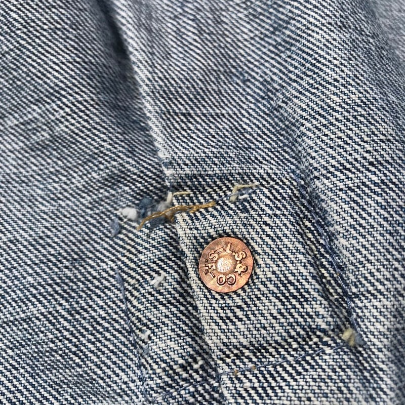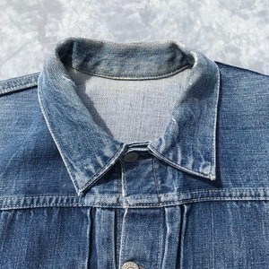 40~50年代の506XXデニムジャケット、通称1st(ファースト)です。こちらは、シンチバックが針無しで、リベットは文字が中央に寄っていますので、1947~1953年頃のモデルとなります。ボタン裏は2プロング刻印無し、フロントボタン5つ、ズレボックスステッチ、ポケットフラップ有り、片面赤タブ、等から戦後の移行期頃の初期型と思われます。全体にフェード感ございます。首元と、シンチバックのリベット部分にリペアございます。右袖肘あたりに、糸抜けの為か、横一文字に線が入っています。サイズは36~38くらいですので、ジャストサイズで着用したり、女性の方でも着やすいサイズ感となります。春から夏に使いやすいカラーです。お探しだった方は必見です。