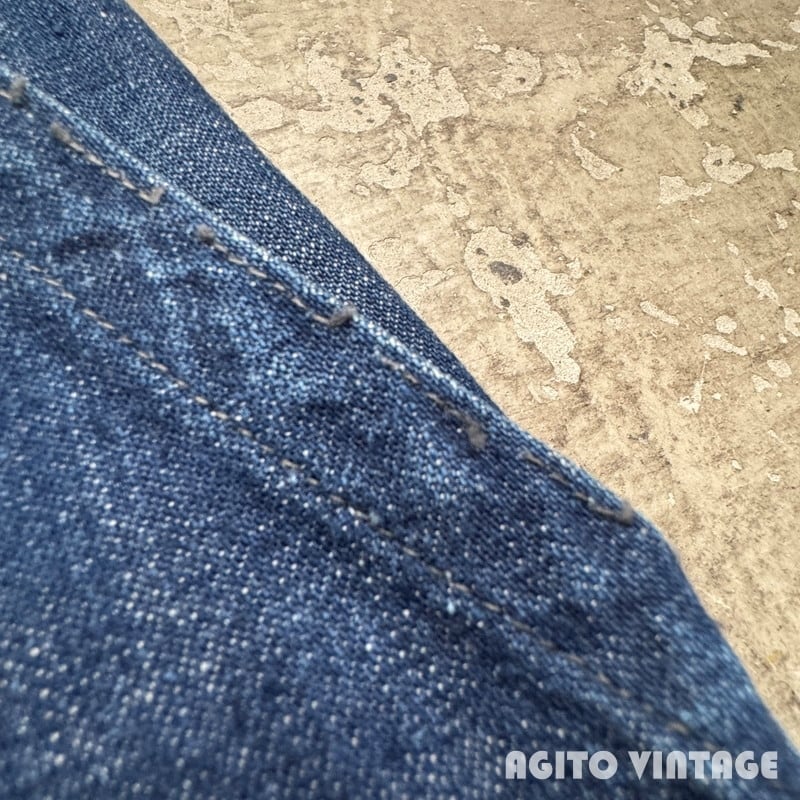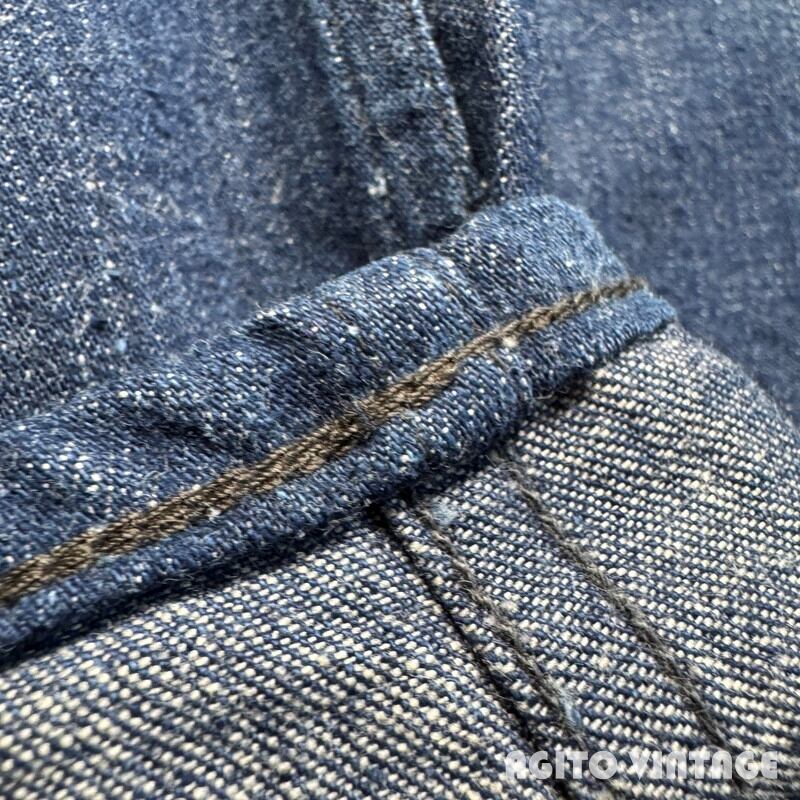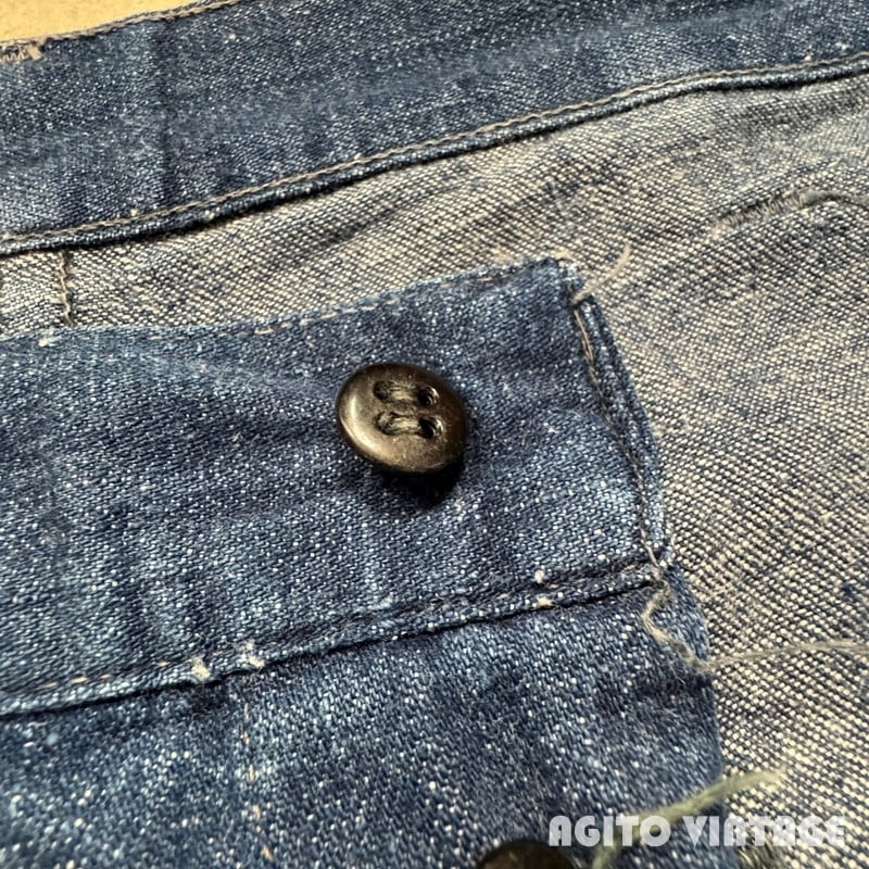 40年代のU.S.NAVY M-45 デニムトラウザーズです。デニムベイカーとも呼ばれるこちらはポケットのステッチや形状がラウンドしているのが特徴的なモデルです。アウトシームとインシームはダブルステッチで縫製されています。ボタンは縫いつけの後期型です。濃紺と言える8割程の色残りが魅力的な1本です。ウエスト内側とバックポケットにステンシルが入ります。おそらくですがレングスはチェーンステッチで裾上げがされてると思われます。細かな擦れや一部にステッチ飛びなどございます。左足後に生地のツナギ目の様な箇所がございます。その他特筆するダメージや目立つ汚れは無くかなりコンディションの良い1本です。ウエストは実寸でW32インチですのでサイズが合う方も多いのではないでしょうか。一から育てるには申し分ないコンディションですのでお探しだった方は是非この機会をお見逃しなく。