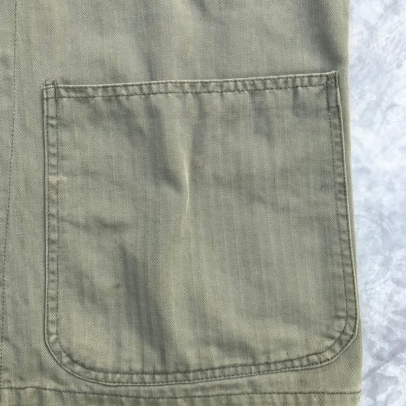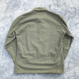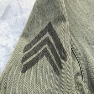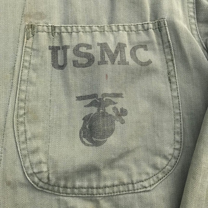 40sのUSMC P-41HBTジャケットです。ミリタリーファンにはお馴染みのヘリンボーンジャケットです。胸元のUSMCのステンシルもまだはっきりと確認できます。両腕には腕章が手描きされています。U.S.MARINE CORPSの刻印のドーナツボタンはラッカー塗膜が剥がれております。首元に小さなリペアがあり、全体的に使用感や小さな汚れ、色抜け等はございますがダメージも少なく綺麗なユーズド品です。通年使えるアイテムですので、おススメです。