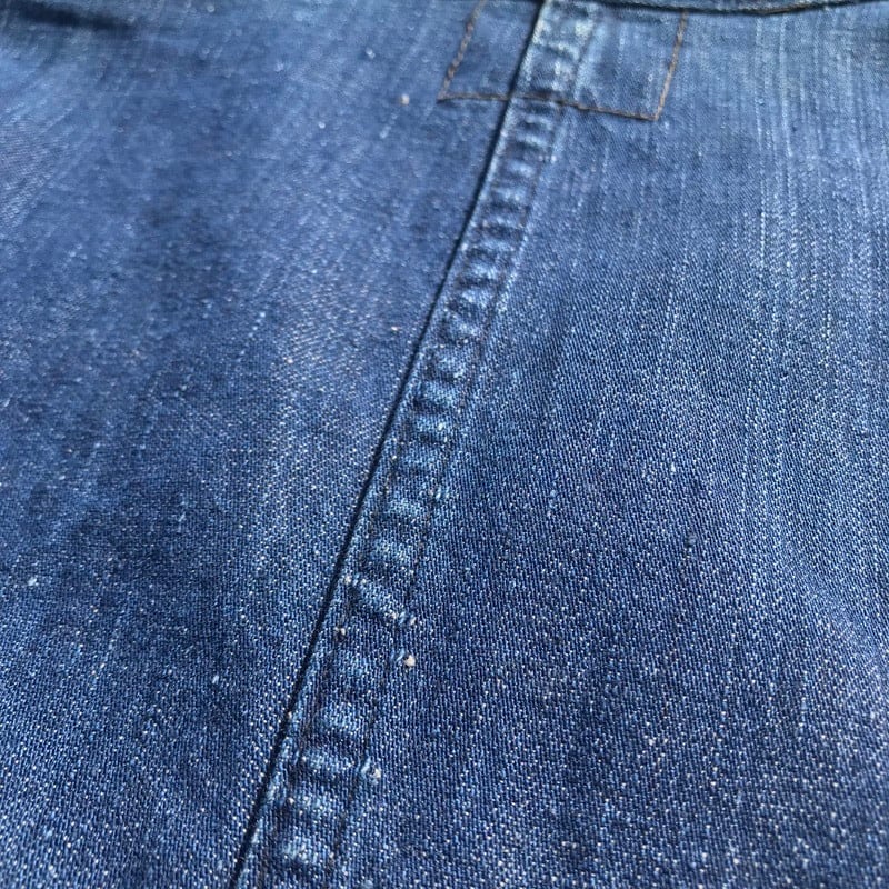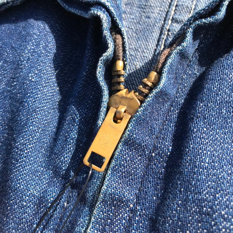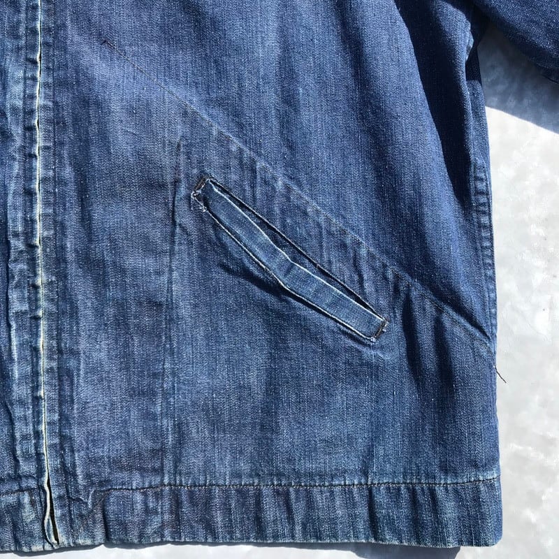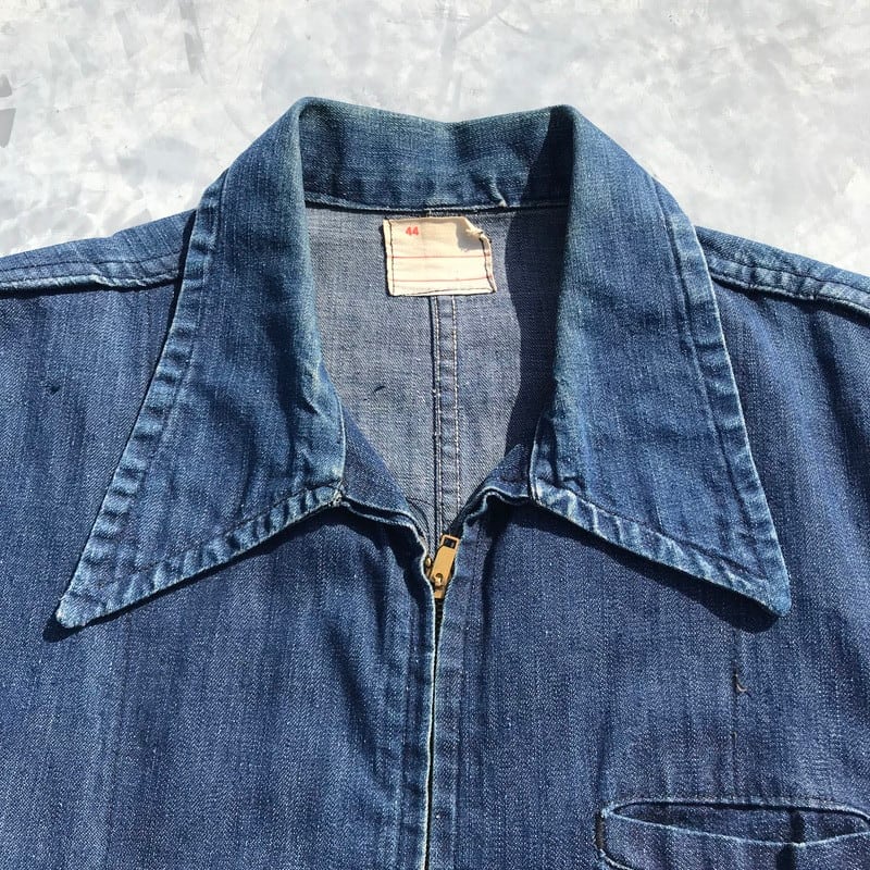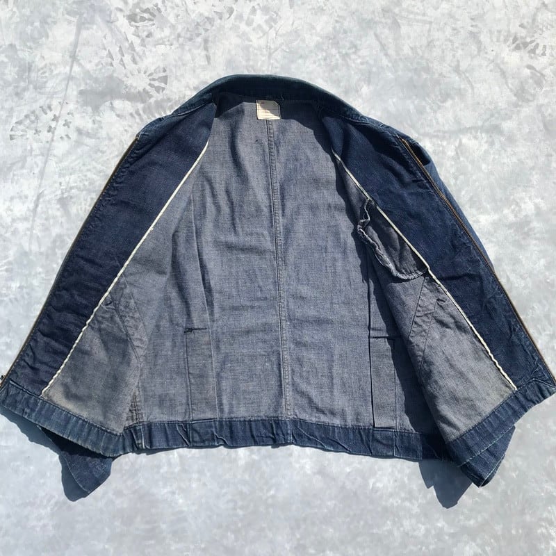 50年代頃のUnknownデニムジップアップジャケットです。NYNCOのピンロックジッパー使用。色もかなり残っておりデニムの生地感などヴィンテージ特有の雰囲気が最高にかっこいい1着です。当時、日本でもUSNより委託で製造されていて、JUN MENなどで有名な株式会社ジュンでも製造された物があるようです。こちらはメーカー不明ですが、首元にタグが残っております。残念ながらサイズ以外は判読不可能です。アームホールの縫い目が少しほつけていますがそれ以外ダメージもほとんど無く44と希少なサイズは滅多に出てこないのでお探しだった方は必見です。