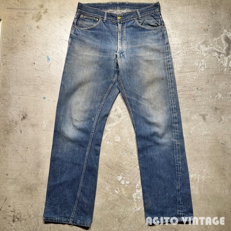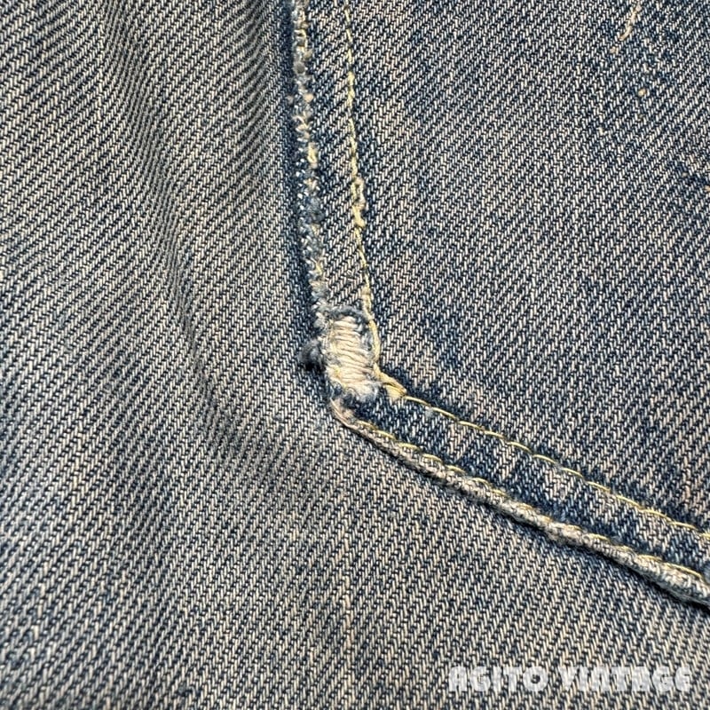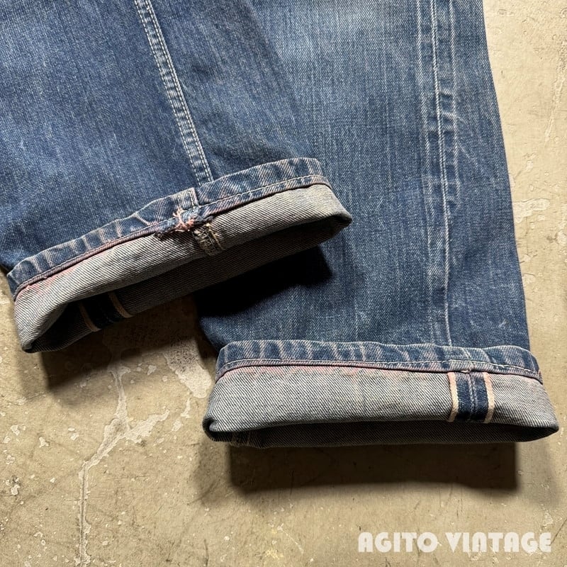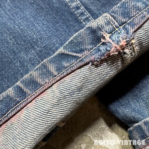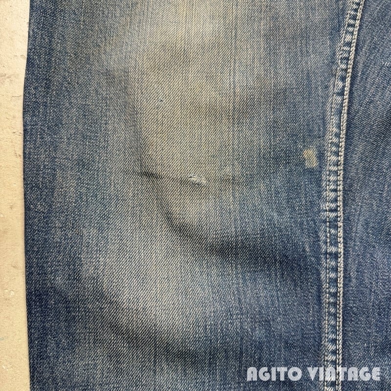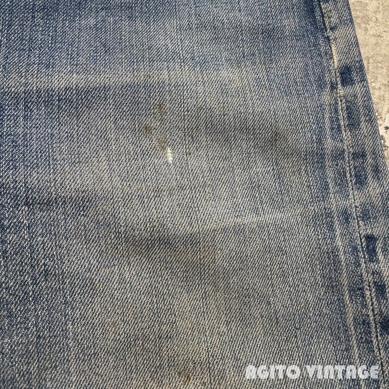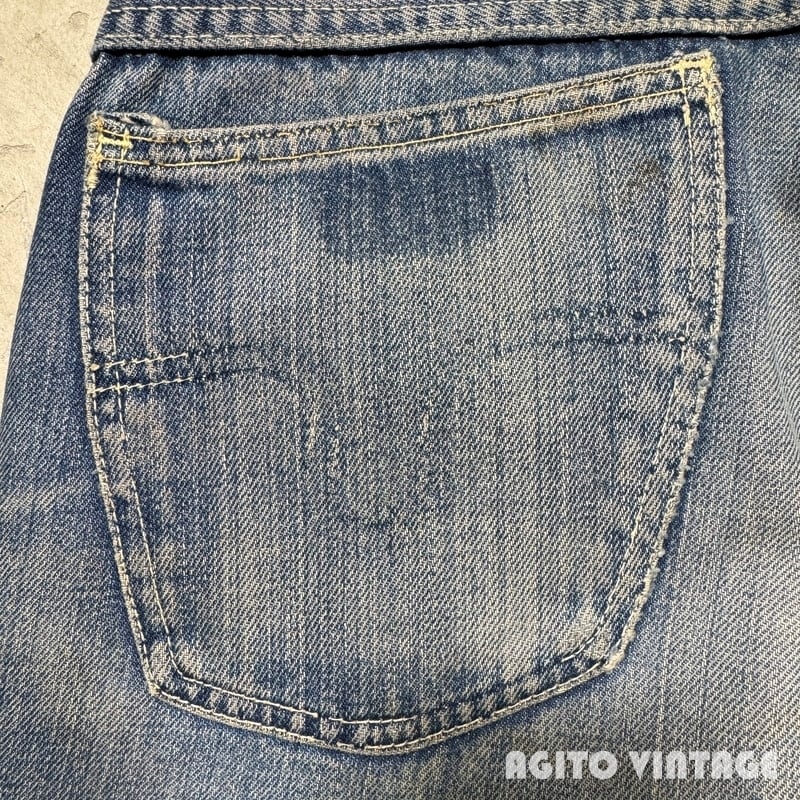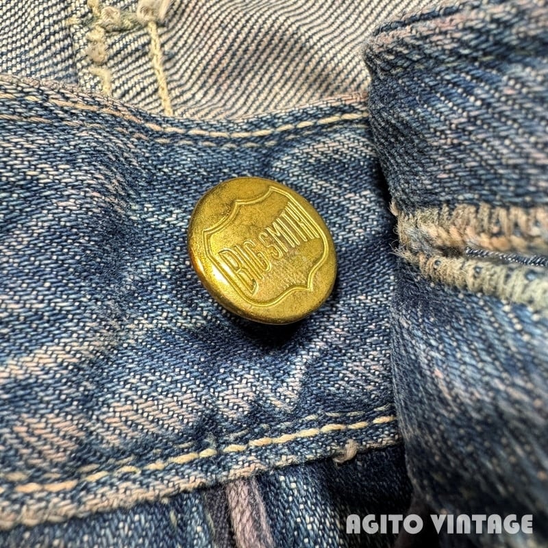 50年代頃のBIG SMITH デニムパンツです。BIG SMITHは1916年ミズーリ州で設立された老舗のワークウェアブランドです。ご紹介するこちらはパッチは欠損していますが、ウェスタンラインのBuckarooシリーズのレザーパッチが付いていたと思われます。フロントはPATWINのピンロックジッパーが使用されています。アウトシームは両耳のセルヴィッジです。全体的に使用感があり、色残りは3=4割程度です。前立てにリペアが施されています。両裾には擦れによるダメ0時がございます。バックポケットの黒タグは欠損しています。その他細かな擦れ等のダメージも見られます。ウエスト付近や裾等にうっすらとピンクっぽい色移りがございます。生地自体はしかりとしていますので長くご愛用頂けます。ウエストは実寸でW33インチですので程よくゆとりがる需要の高い良いサイズ感だと思います。特徴的なバックポケットのステッチもヴィンテージデニムらしい色落ちです。シルエットも綺麗ですのでサイズが合う方は是非いかがでしょうか。
