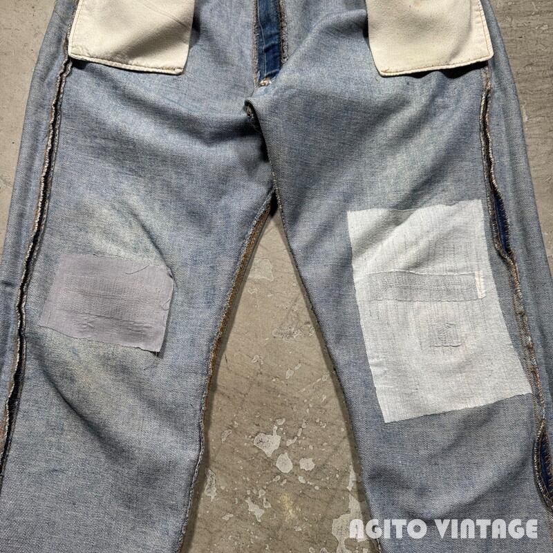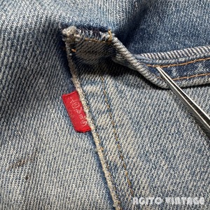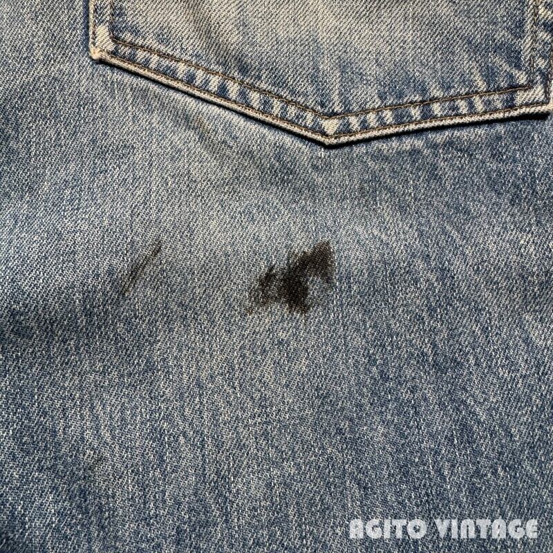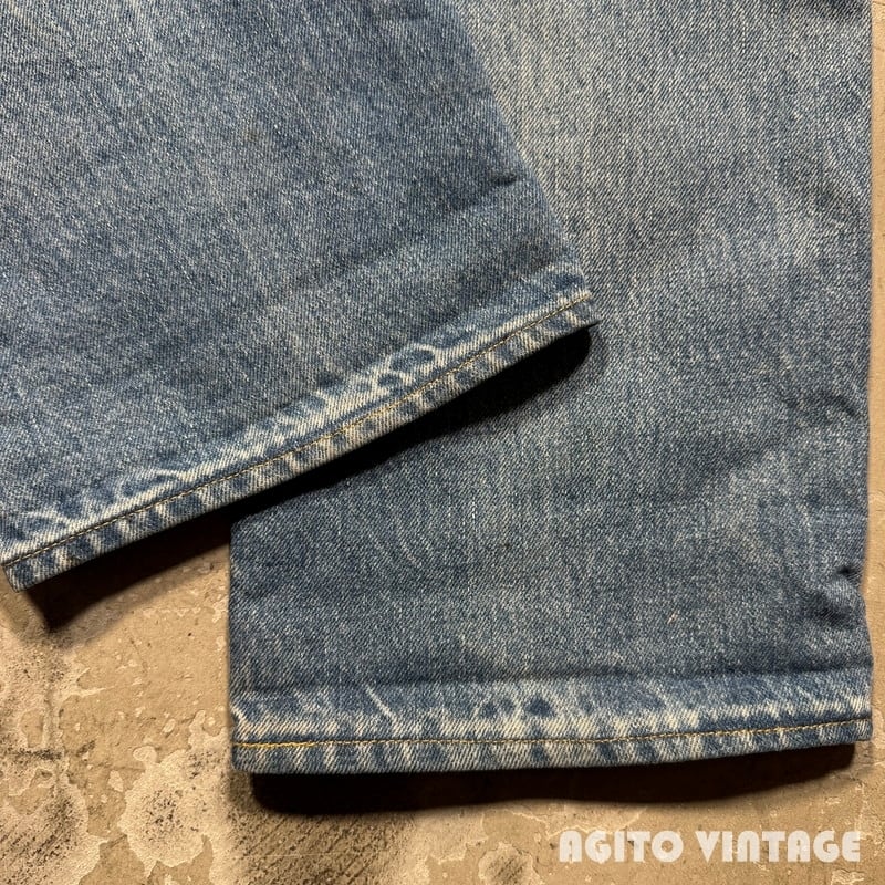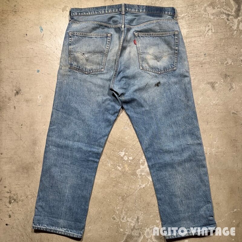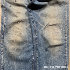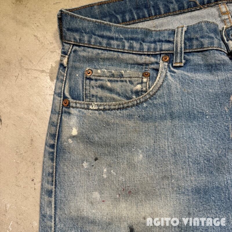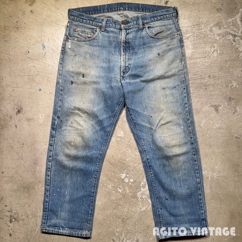 70年代のLevi's 505デニムパンツです。刻印5、42TALON、サイド脇割り、赤タブスモールe。所謂66前期と呼ばれるモデルです。色残りは3割程でややのっぺりとしていますが、ペンキなどの汚れが良い塩梅に入った1本です。両膝と左バックポケット上にリペアが施されています。レングスはシングルで裾上げされています。その他擦れ等の使用感はございますが、生地自体はしっかりとしています。ウエストは実寸でW38とややゆったりサイズですが、オーバー気味で穿いてペインターパンツのようなワーク感も楽しんでいただけるかと思います。フェードしたバンTeeと合わせてもカッコ良いのでサイズが合う方は是非この機会にいかがでしょうか。