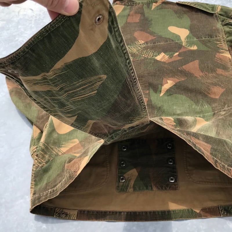 60年代頃のパキスタン軍デニソンスモックと思われます。40年代のブリティッシュアーミーのファーストパターンやローデシア軍のような首元のフランネル地や、袖リブといったディティールが非常に興味深い1着です。ビーバーテイルと呼ばれるパーツですが、使用しないときに留めておくボタンがございませんので、着用時は垂れたままの状態です。ボタンをつける必要がございます。大き目のサイズですので、実寸を必ずご確認ください。