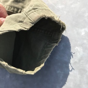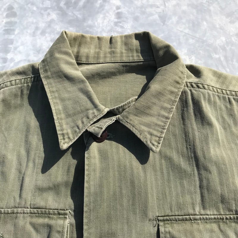 40~50年代のM-47HBTユーティリティーシャツです。OG107の前身にあたるヘリンボーン地で第1ボタンと第2ボタンの間隔が広いタイプです。袖や袖口、フロントや首元に少しダメージはございますが、雰囲気は抜群です。P-41などお好きな方におすすめです。