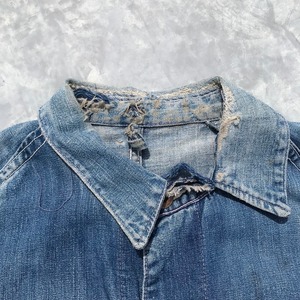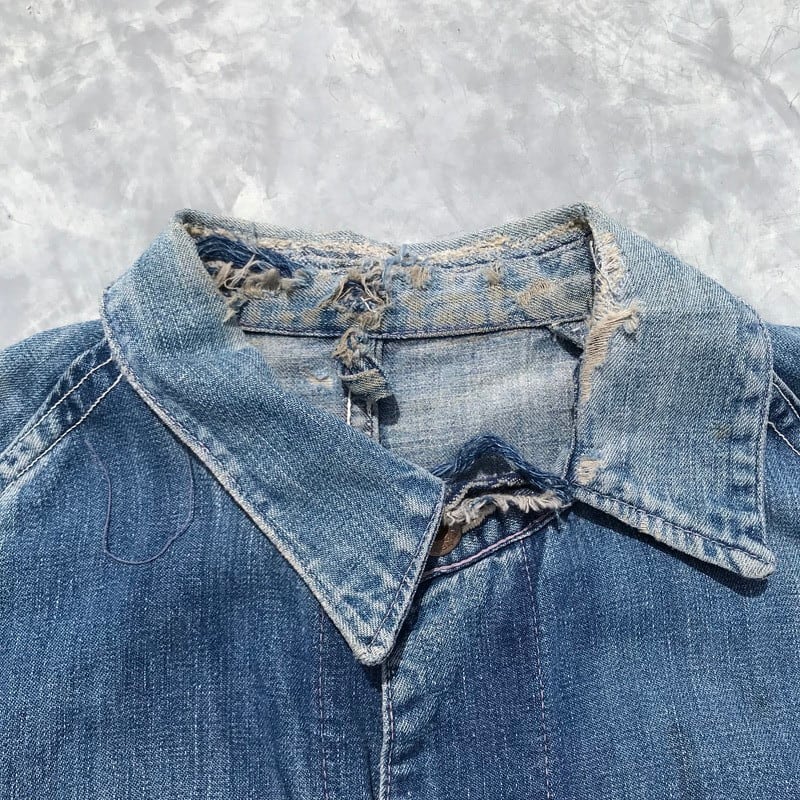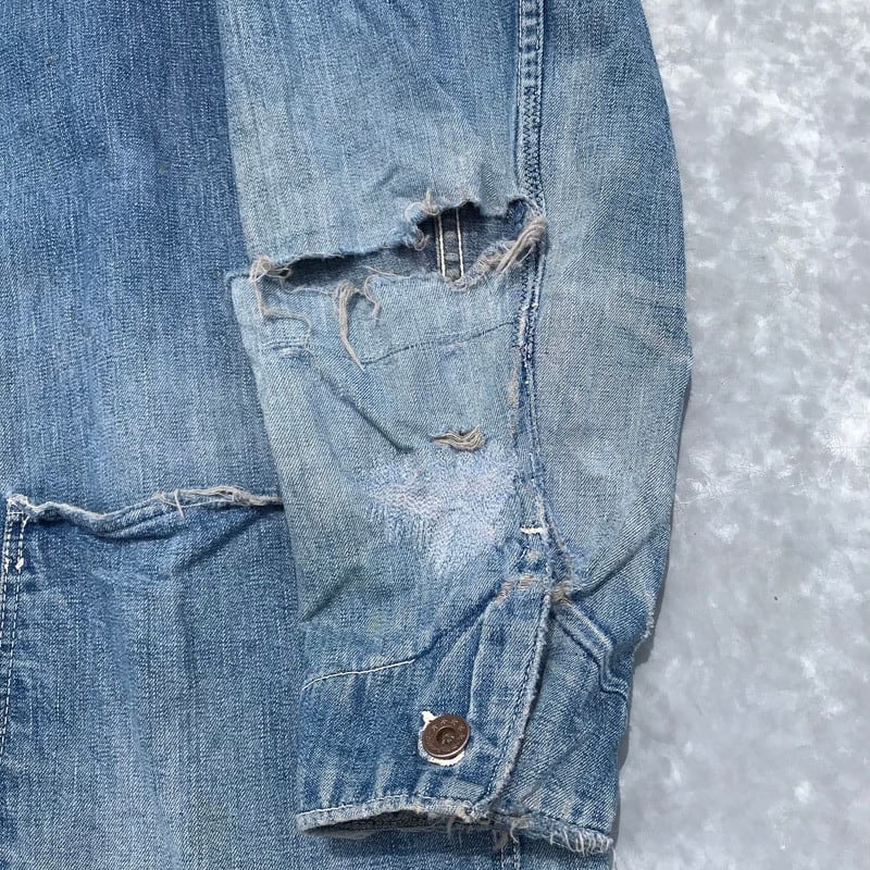 40年代頃のデニムカバーオールです。大戦モデルと呼ばれるディティールで、月桂樹ボタン(ラッカー塗膜はほとんど剥がれています)や、ダブルステッチ、2ポケットとその当時物と思われます。フェード感や雰囲気は抜群ですが、全体にリペアが必要なダメージがございますので、お値打ち価格での出品です。リペアできる方、リペアで楽しめる方には大変おススメです。サイズは40~42くらいです。