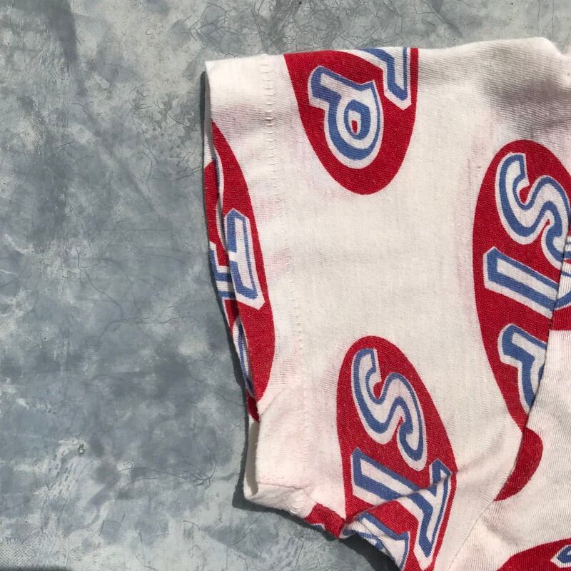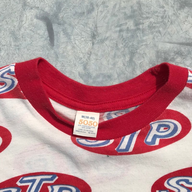 80年代のSTP総柄ロゴTシャツです。STPは1953年創業のアメリカのエンジンオイルメーカーです。全面にロゴが染み込みプリントで施されとてもPOPなデザインです。企業物の総柄は今も人気で、コレクターも多いアイテムです。