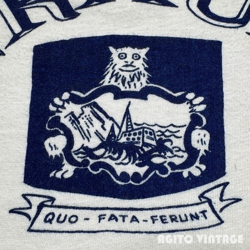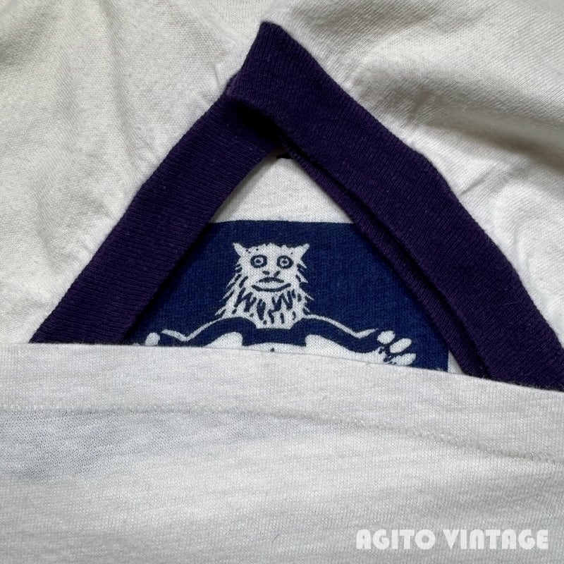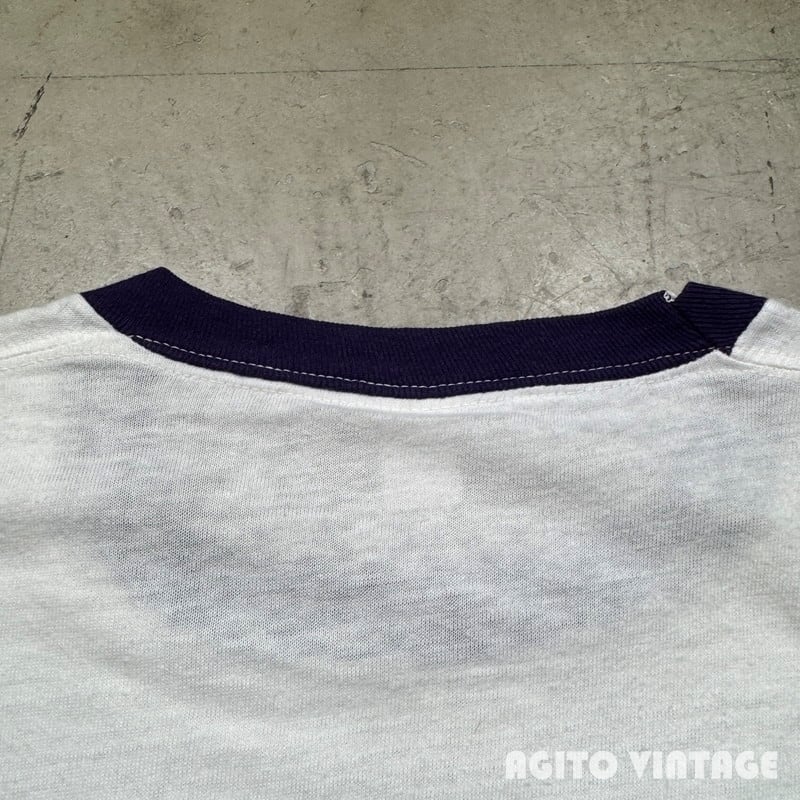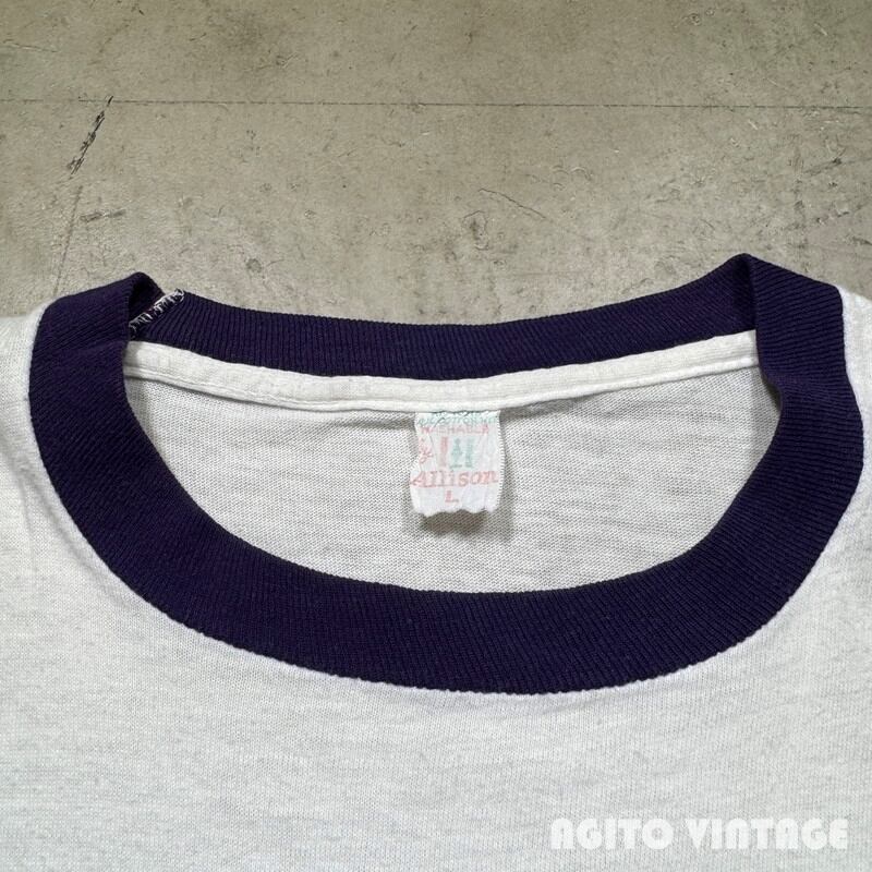 70年代から80年代頃のAllison リンガーTシャツです。詳細は不明ですが古着でたまに見かけるAllisonというメーカーのリンガーTeeに染み込みでプリントが入ります。トリムはパープル、プリントはネイビーです。バミューダ諸島の国章が描かれています。全体的にやや毛羽立ちや薄汚れはあるもののダメージは無くコンディションは良好です。L表記でこの手のリンガーTeeとしては比較的ゆとりのあるサイズ感だと思います。パープルとネイビーの組み合わせも良いのでオススメです。