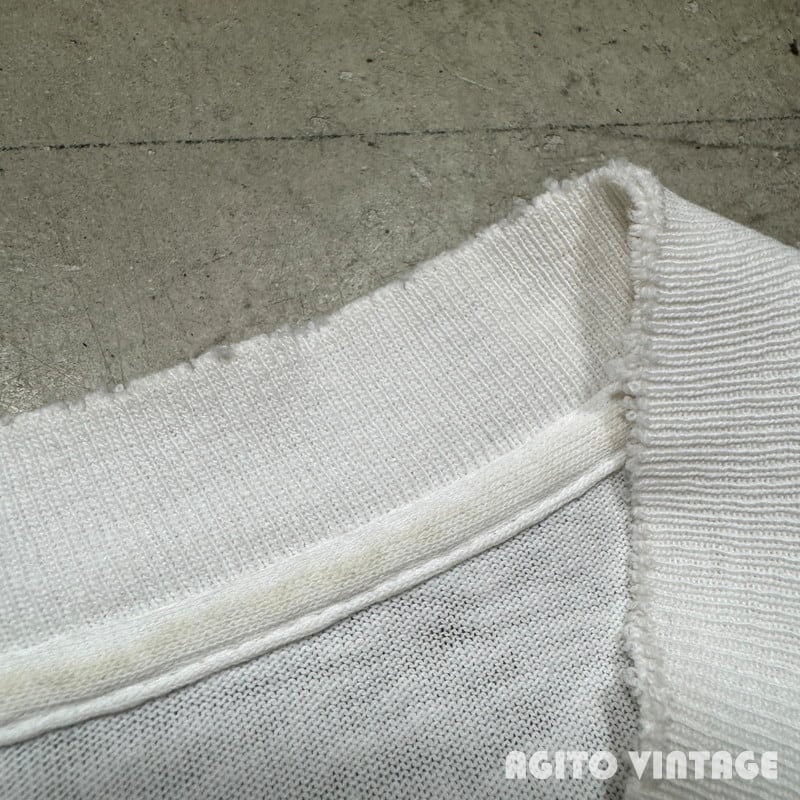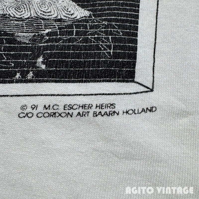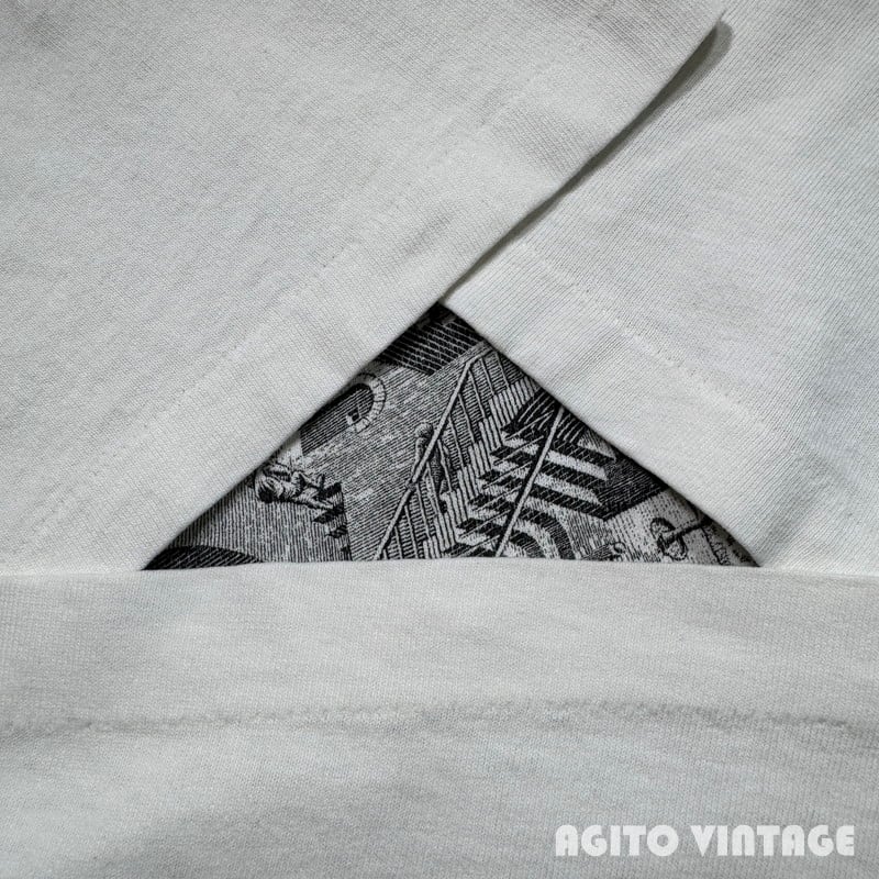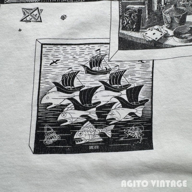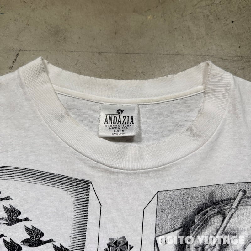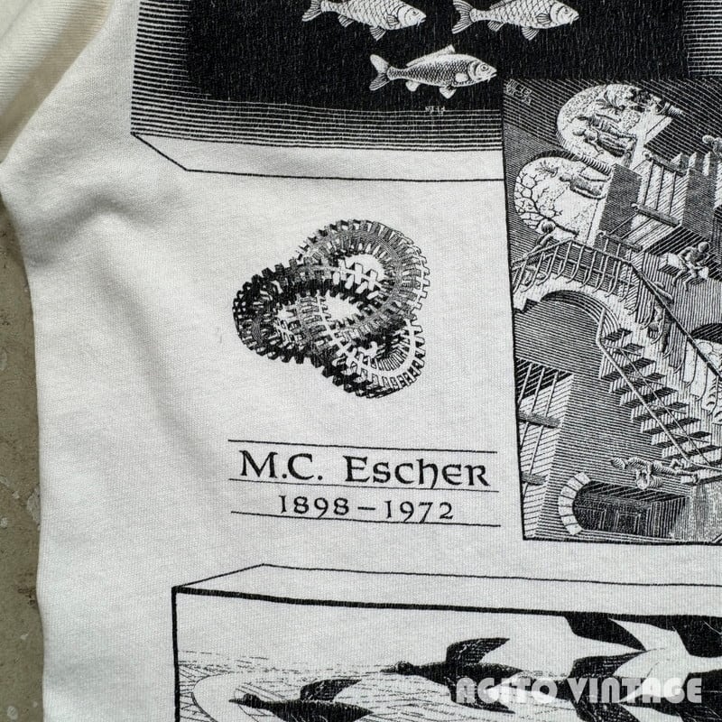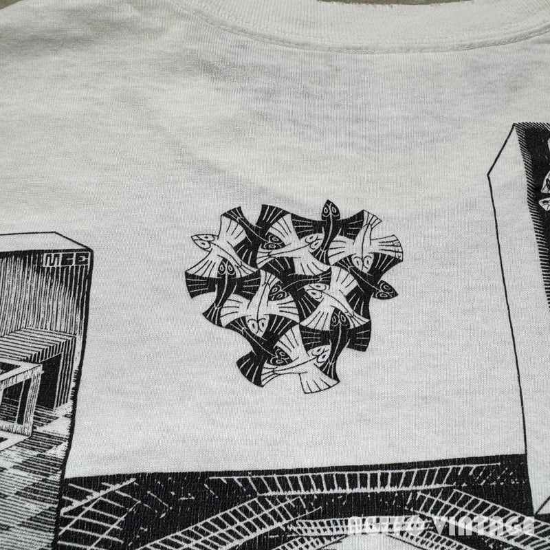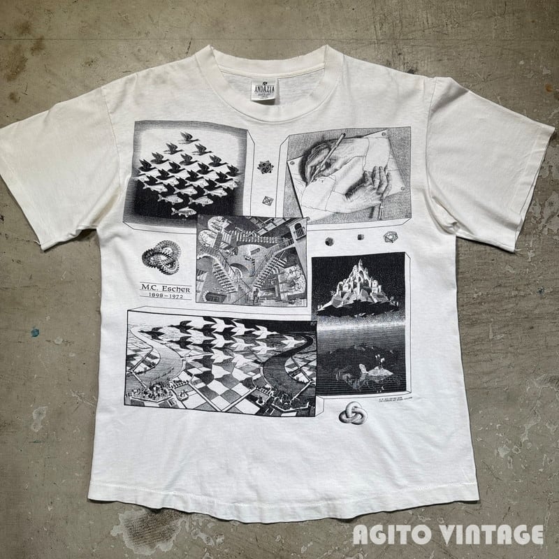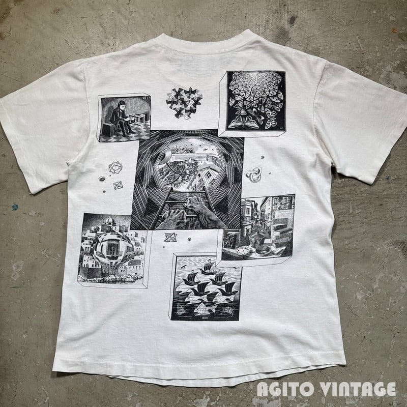 90年代のM.C.ESCHER騙し絵アートTeeです。ボディはANDAZIAのUSA製で91年のコピーライトが入ります。M.C.ESCHER(1898-1972)はだまし絵などの作品で知られるオランダ人画家です。言わずもがな古着でアートTeeといえばエッシャーと言っても過言では無いほどに知名度の高いアイテムです。今回ご紹介するこちらは全面に作品がマルチにプリントされた1着です。有名な「描く手」や「相対性」、「空と水I」等が各所に配置されたデザインです。全体的にやや使用感があり、ネックにややダメージがございます。その他薄汚れ等もございます。L表記ですがM~L相当のサイズ感だと思います。単体の作品がプリントされたものもございますが、やはりエッシャーといえばマルチプリントの印象も強くひと目でわかるデザインがお好きな方も多いのではないでしょうか。お探しだった方はは是非この機会にいかがでしょうか。