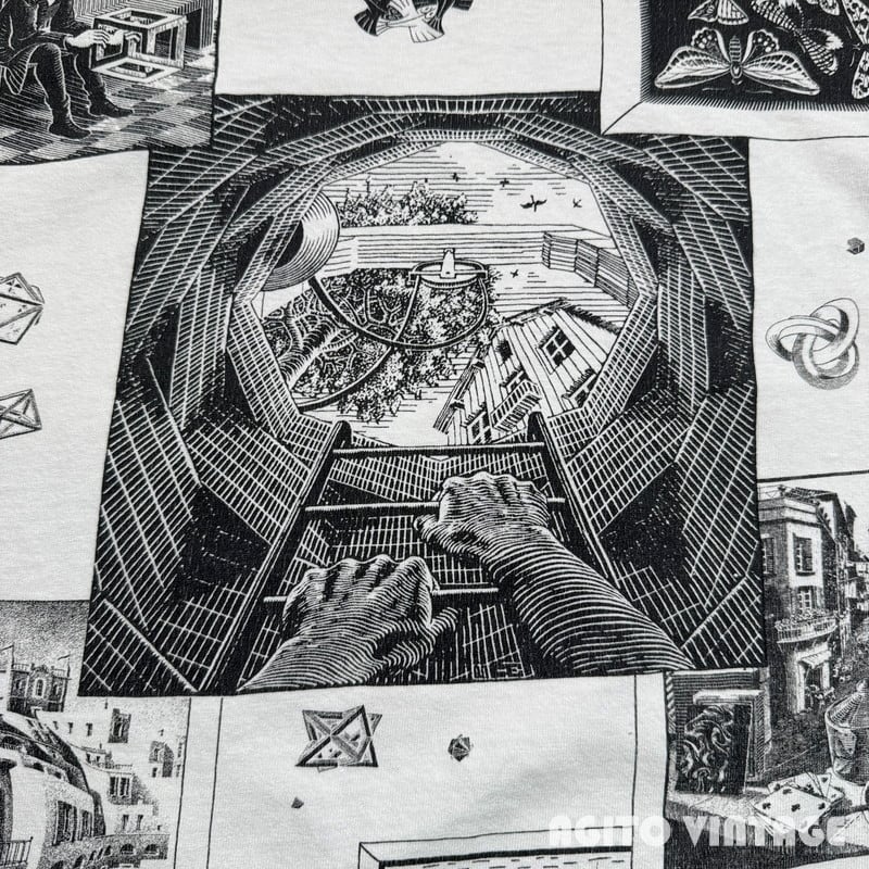 90's M.C.ESCHER エッシャー 騙し絵 アートTee マルチプリント ANDAZIA 描く手 相対性 空と水I Stars M~L相当 USA製 希少 ヴィンテージ BA-2784 RM3205H