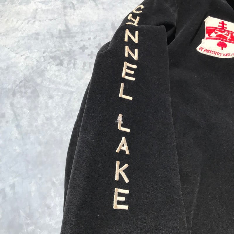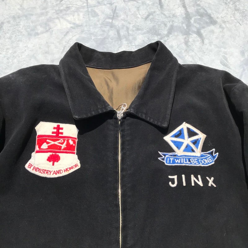 60年代のジャーマンスーベニアジャケットです。全面に贅沢に施された刺繍が見事です。ベロアの様ですが、ユーロミリタリーやワークジャケットに使われるモールスキンとなっており、珍しい1着です。バックのブルドーザーが非常に眼を引く1着です。使用感はございますが、両袖口にダメージ、内側中央に小穴がございますが大きなダメージ等も無く美品です。サイズもゆったり目でLサイズくらいですので、