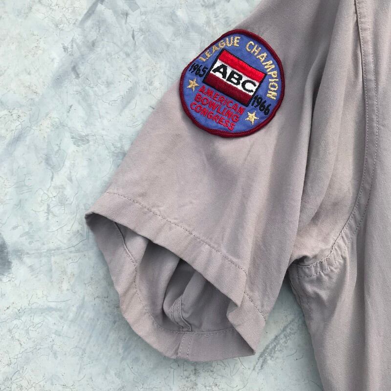 50年代のKing Louieボーリングシャツです。あまり見かけないグレーボディーで、両肩にワッペンが付いています。背面はチェーンステッチです。裾にユニオンチケットもございます。目立つダメージはほとんどございませんが、フロントに2,3か所シミがございます。Mサイズ感ですので、男女共に着用しやすいと思います。