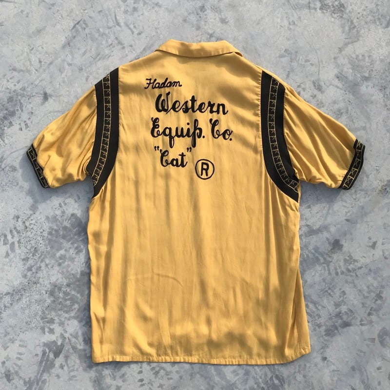 50年代頃のAir floのボーリングシャツです。袋縫いの襟、サイ度巻き縫い、リブの切り替えもお洒落です。ボタンは全てピンボタンで、一番下にスペアが1つ付属します。Western Equip.Co.のチェーンステッチが背面に入ります。リブ部分の柄はスコアボードのような柄で遊び心のある1着です、首元にうっすらと汚れはございますが、目立つダメージ等はない美品です。