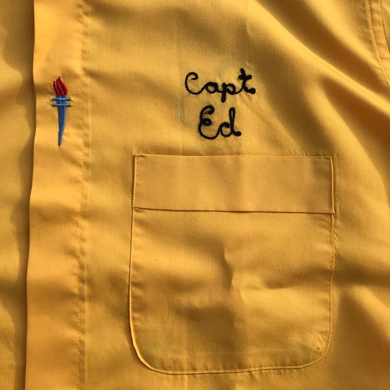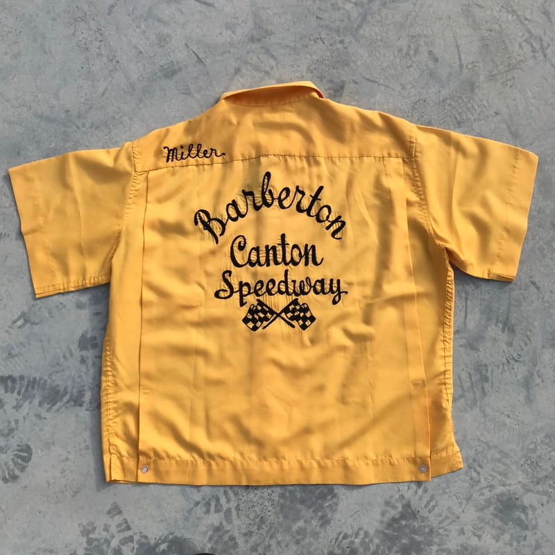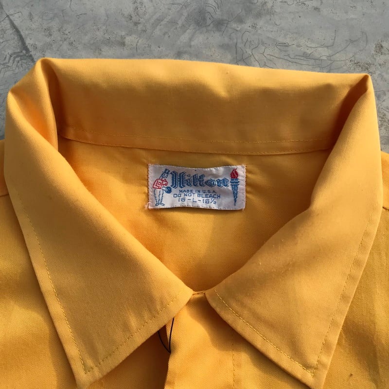 70年代頃のHiltonボーリングシャツです。こちらはボタンが表面に見えないようになっているタイプです。フロント真ん中にはHiltonのタグにも描かれているたいまつが刺繍されています。Barberton Canton Speedwayの刺繍が背面に入ります。ブラックイエローは夏に映えますので、様々なコーディネートに合わせていただけます。