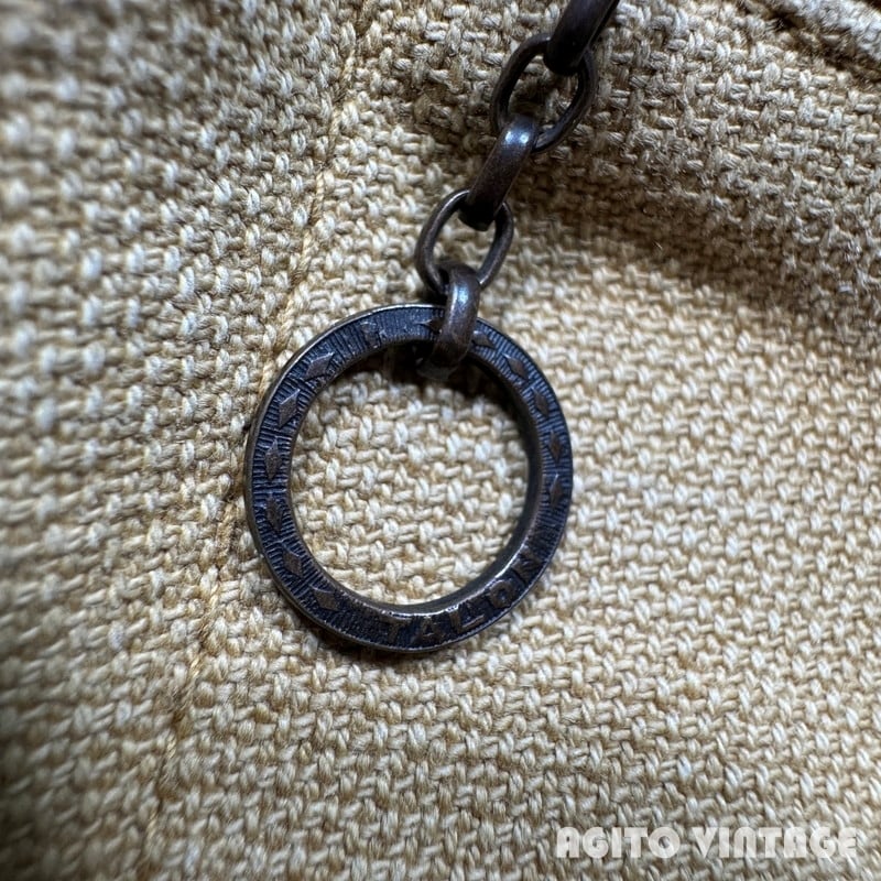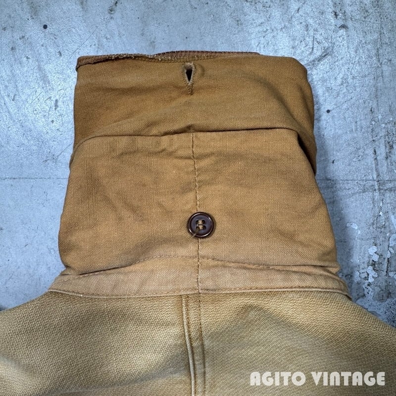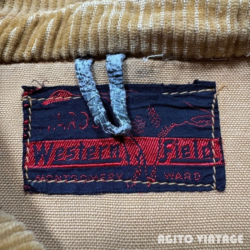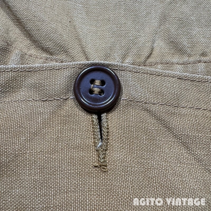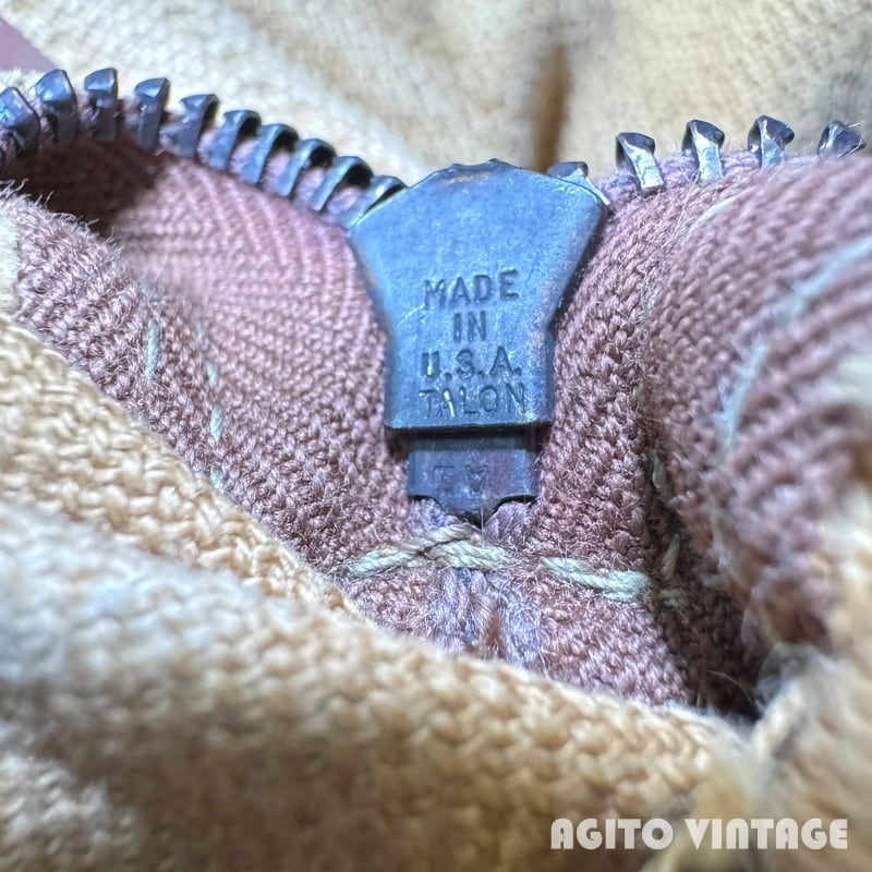 40年代頃のWESTERN FIELDモールスキンハンティングジャケットです。WESTERN FIELDはアメリカ3大ストとして知られるMONTGOMERY WARDがアウトドアやハンティングウェアを展開していたプライベートブランドです。ご紹介するこちらは首元に古いタグが付きます。一般的なハンティングウェアで見られるダック地では無くモールスキン地(フレンチモールスキンの裏表が逆になったような生地)が使用された珍しいモデルです。襟はコーデュロイで、襟裏には防風、防寒用のフラップが折り込まれています。胸ポケットにはリングチェーンのTALONジッパーが使用されています。ジップエンド裏にA1の刻印がございます。A1刻印は1931年か1941年のどちらも使用されていますが、恐らく1941年の物だと思われます。フロントのボタンは全て付け替えられています。ゲームポケットはジップでは無くボタンで留めるタイプで内側に汚れはございません。ゲームポケットの縁に小さなダメージがございます。その他擦れや薄汚れ、色褪せ等の使用感はございますが目立つダメージは無くコンディションは良好です。サイズ表記はございませんがL相当かと思われます。ヴィンテージハンティングジャケットの中でもなかなか見る機会が少ないモールスキン地ですのでお探しだった方は是非この機会をお見逃しなく。