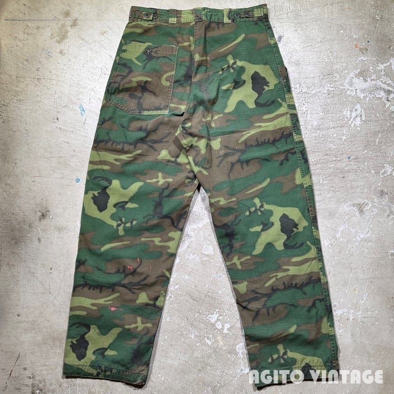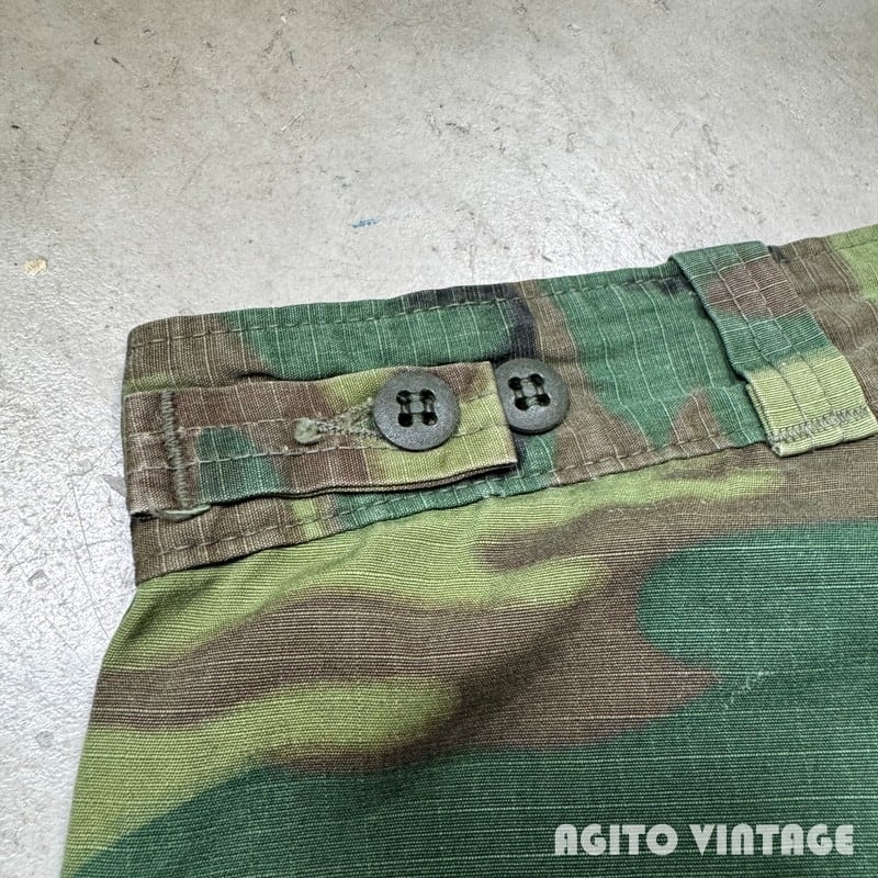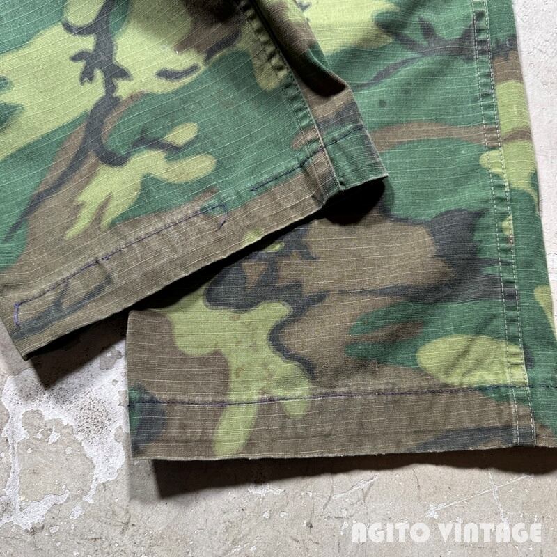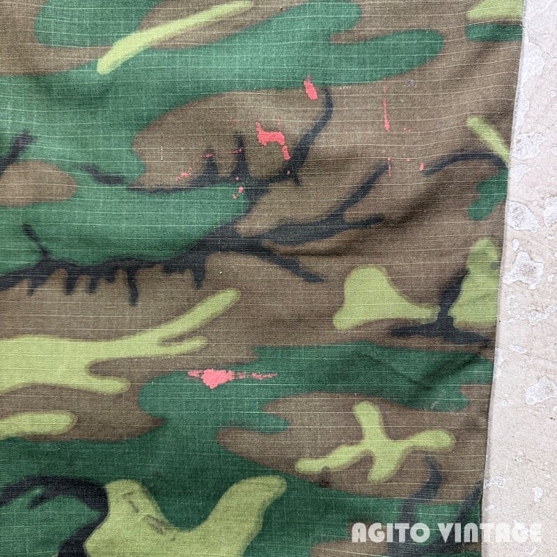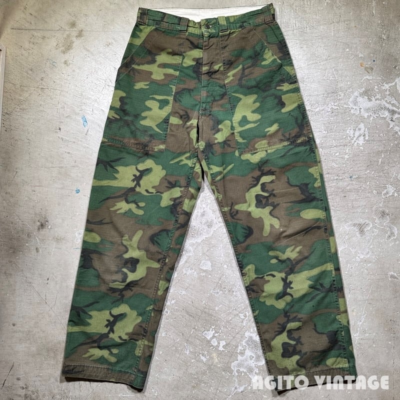 70年代頃のGAME WINNER SPORTSWEAR リップストップベイカーパンツです。GAME WINNER SPORTSWEARは1938年に創業したAcademy Sports + Outdoorsのアウトドアラインです。ご紹介するこちらは、ベトナム戦争時のERDL迷彩のリップストップ生地を使用したベイカーパンツタイプで、Academy Sports + Outdoors社の創業者であるマックス・ゴッホマンの息子アーサー・ゴッホマンが1970年代に軍放出品を扱うチェーン店を買収した事で大量の迷彩生地等を手に入れる事が出来、その生地で様々なハンティングウェアを製造していたようです。ジッパーはアルミの42TALONが使用されています。ウエストサイドにはボタンのアジャスターがありウエストを調整できます。バックは左のみポケットが付く片ポケ仕様です。薄汚れや左ふくらはぎ付近にピンクっぽいペンキ飛びが見られます。お尻の付け根付近に小さなハンドリペアがございます。擦れや細かな小傷等ございますが、その他生地はしっかりとしておりコンディションは良好だと思います。ウエストは実寸W30インチでゆったりとしたシルエットです。少し変化球なデザインで人と被りにくいと思いますのでサイズが合う方は是非この機会にいかがでしょうか。