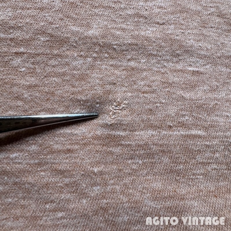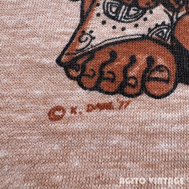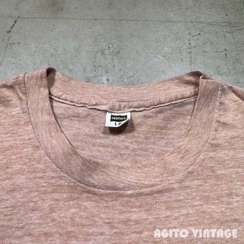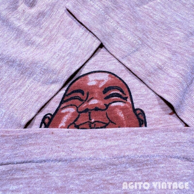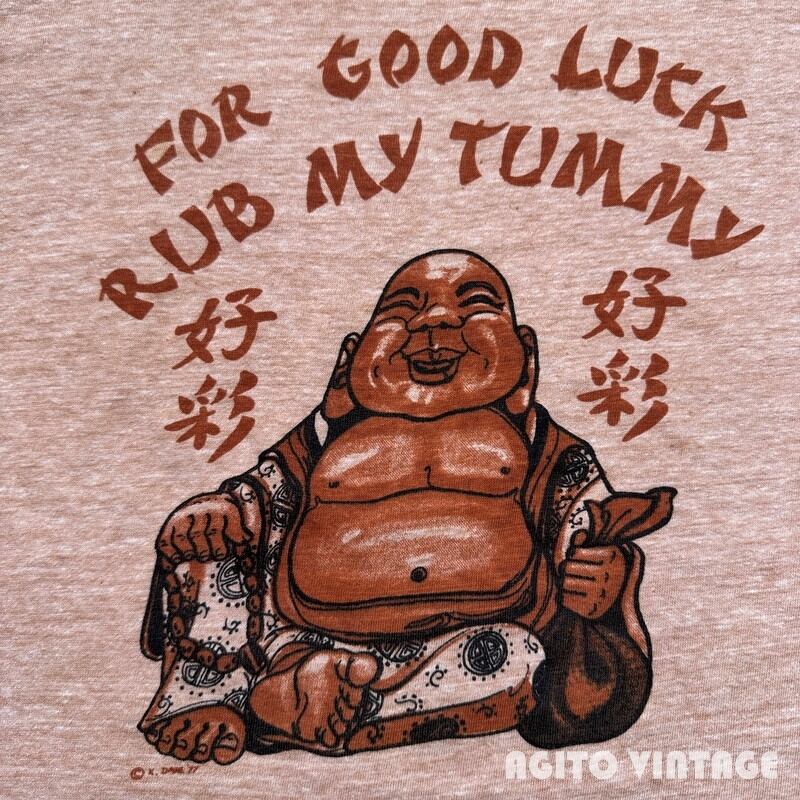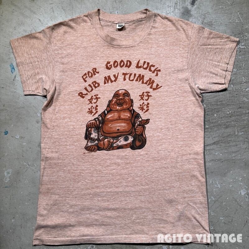 70年代nHanes 染み込みプリントTeeです。ブラウン杢で袖スト共にシングルステッチです。フロントにFOR GOOD LUCK RUB MY TUMMY(お腹をさすって幸運を祈るの意)と布袋様、中国語で幸運を意味する好彩の文字が染み込みでプリントされています。字が若干潰れていますが77年のコピーライトが入ります。全体的にやや毛羽立ちがございます。フロント裾付近に小さなハンドリペアがあり、裾と背面左脇付近に小さなピンホールがございます。その他コンディションは良好かと思います。L表記ですが身幅は細目です。オリエンタルな雰囲気がお好きな方は是非いかがでしょうか。ブーツカットやベルボトムと合わせるのもオススメです。