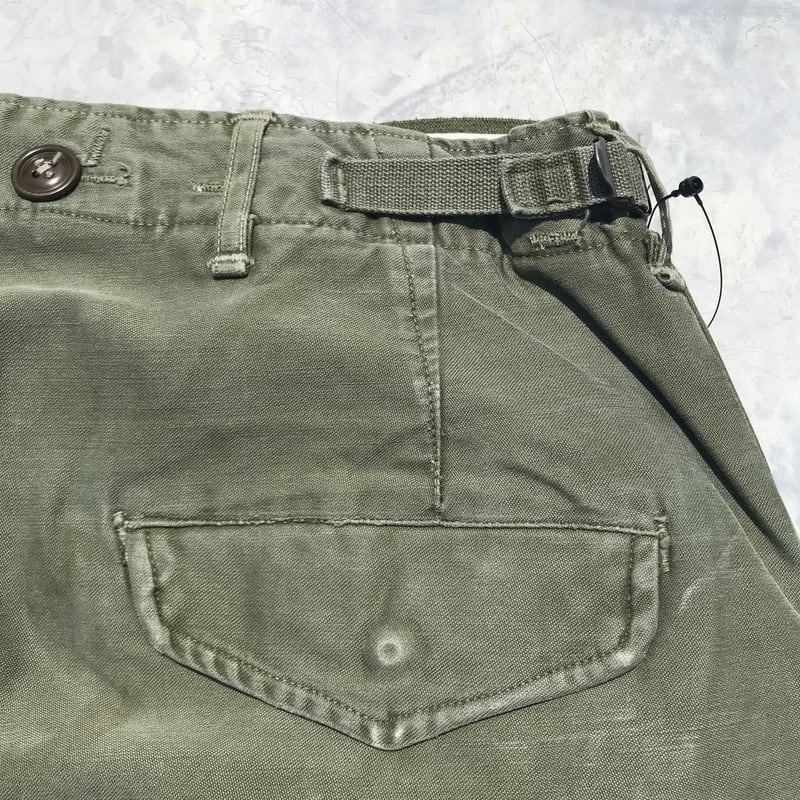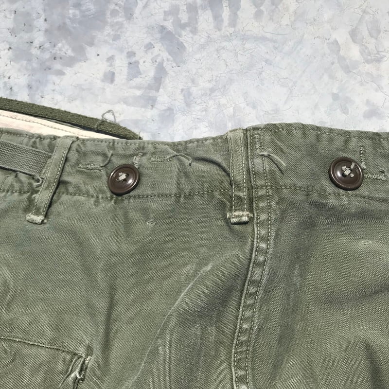 50年代初頭のM-51フィールドパンツです。納入年度は1952年。見るスペックはかすれてはっきりと確認できません。WALDESジッパーでコの字留めです。ミリタリーパンツの代表といえるフィールドパンツですが、M-65にくらべM-51は年々入手しづらくなってきています。今回のこちらの個体は、全体に使用感とところどころに汚れはございますが、大金ダメージはございません。MIDEUM REGULARですのでゴールデンサイズです。