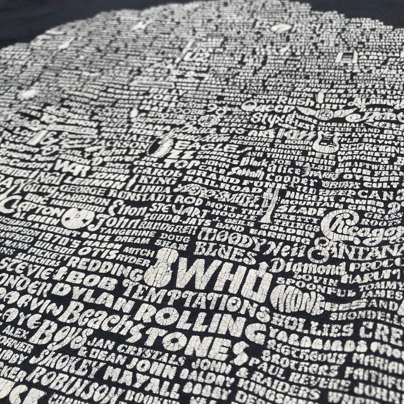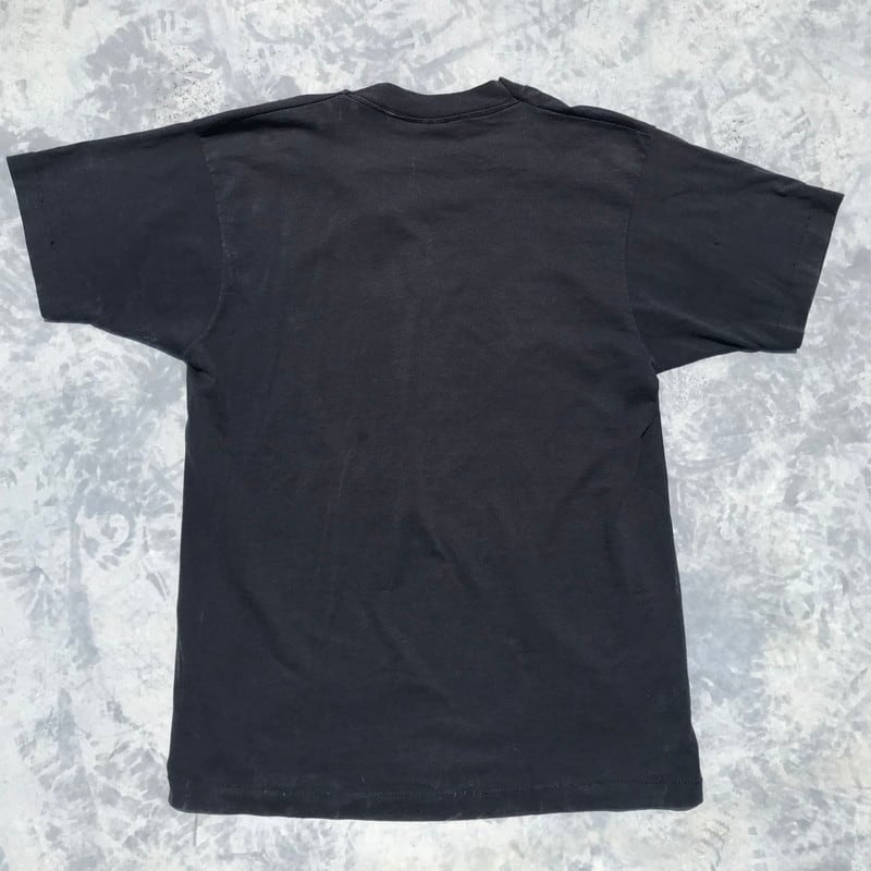 90年代初頭のFAMILY OF TREE ROCK'N ROLL Tシャツです。ボディはSCREEN STARSの黒タグです。アメリカのロックミュージシャンの名前がずらりと並んだデザインで、このタイプの他に木の周りが囲まれているものなど数種類あるそうです。以前は古着屋等で良く見ましたが最近ではあまり見かけなくなり探されていた方も多いのではないでしょうか。右袖後ろに小穴があります。これからの季節に着やすいLサイズですので、ショーツと合わせてフェスなどのイベントに着ていくのもおススメです。