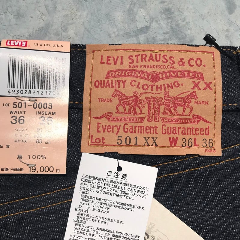 2001年製造の501XXデッドストックです。USA製で人気のバレンシア工場産で、2000年代に入りアメリカ工場が閉鎖された為、USA製の最終期のモデルです。