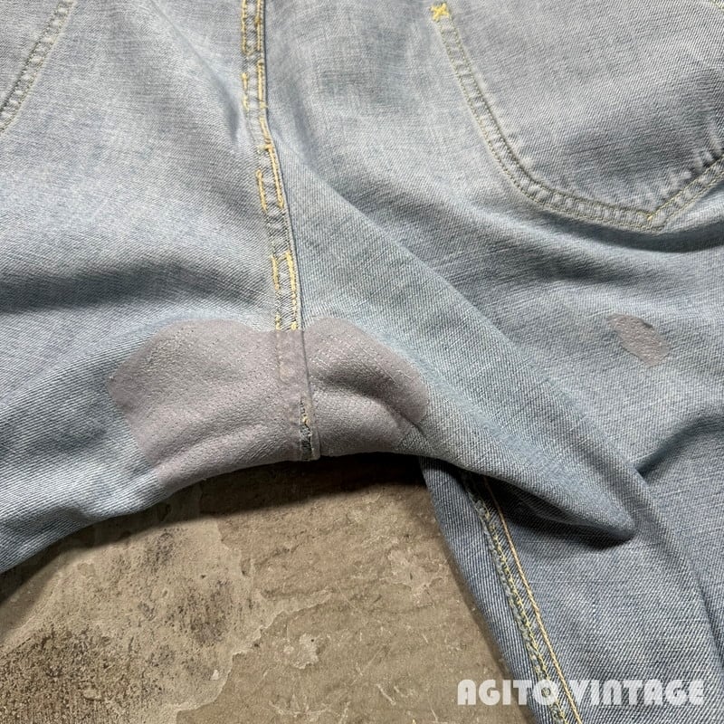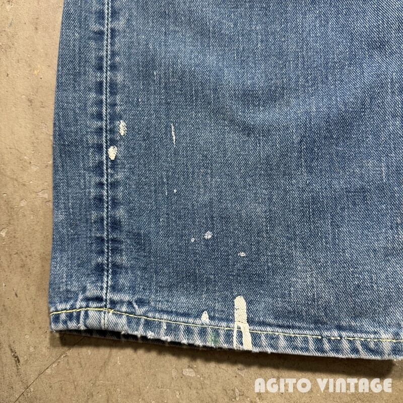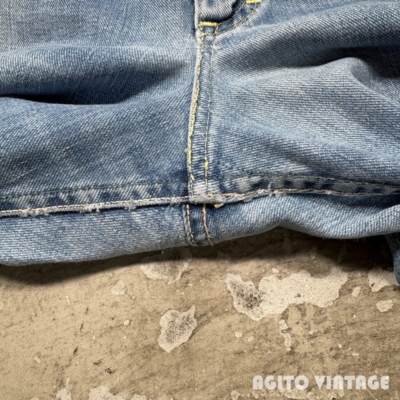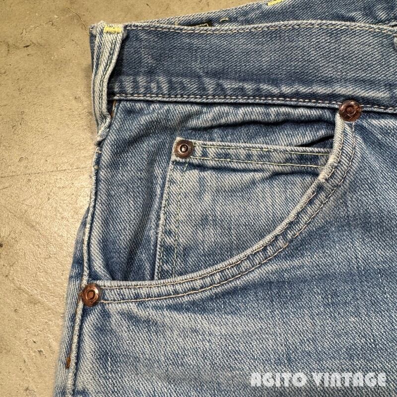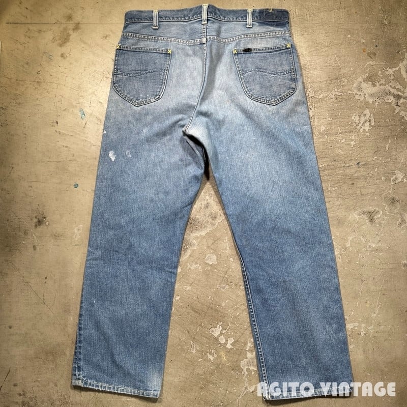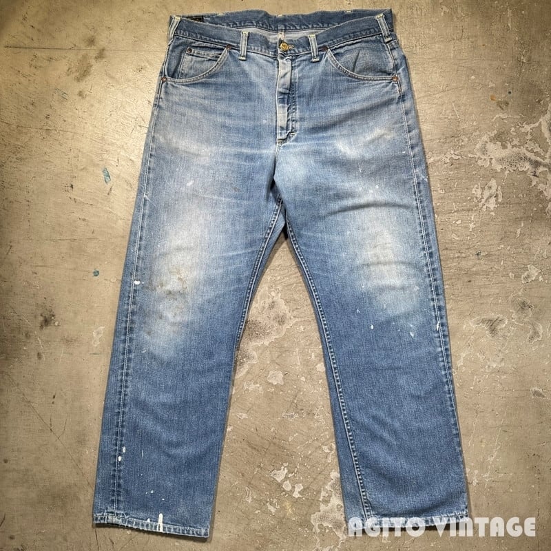 60年代から70年代初頭頃Lee RIDERS 101Z デニムパンツです。サイド黒タグ、MR有り、TALONセミオートマチック、バックポケット当て布あり、サイド脇割り。3割程の色残りですがうっすらとヒゲが入る個体です。ペンキ飛びや薄汚れがありますのでワークな雰囲気も楽しめる1本です。左膝とお尻の付け根には丁寧にリペアが施されています。右腿から膝付近が若干生地が薄くなっています。その他細かな擦れ等ございますが、コンディションは悪くありません。ウエストは表記通りW36インチとゆったりとしたサイズです。夏場に使い易い色味なのでハワイアンシャツ等と合わせてみてはいかがでしょうか。