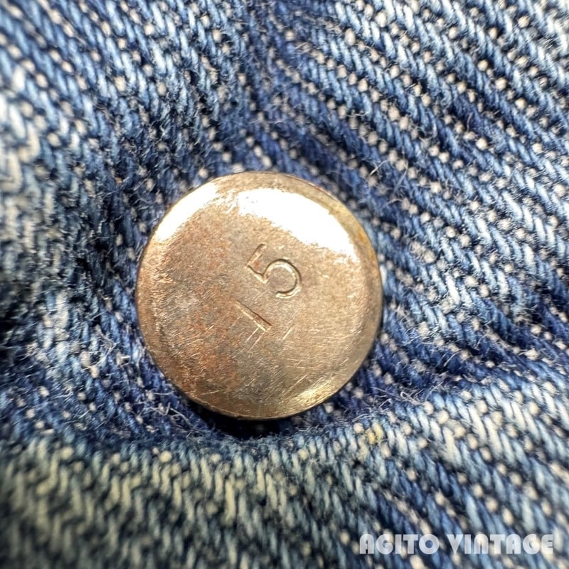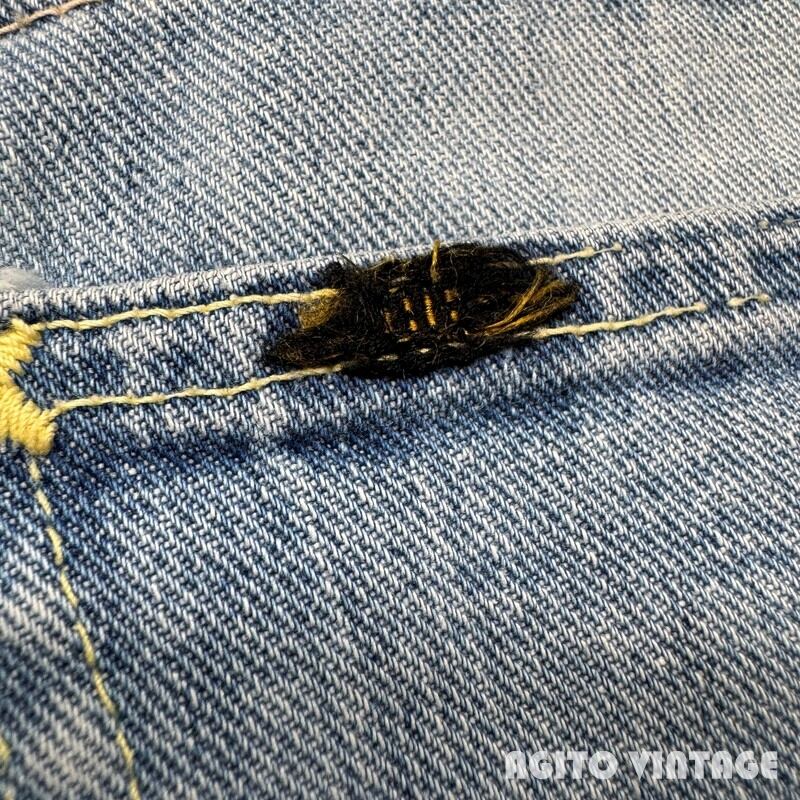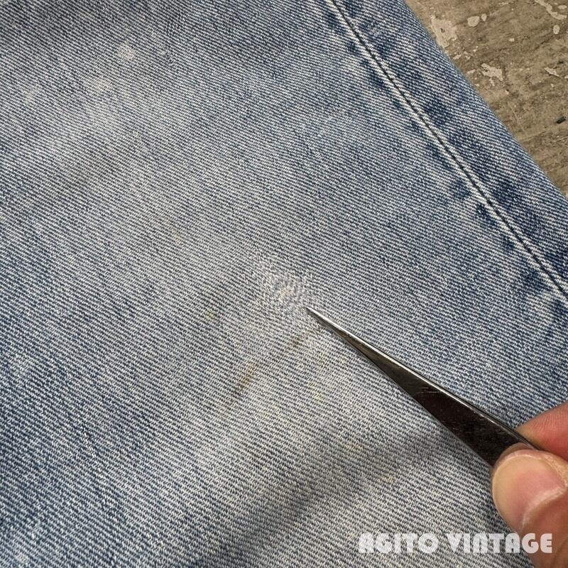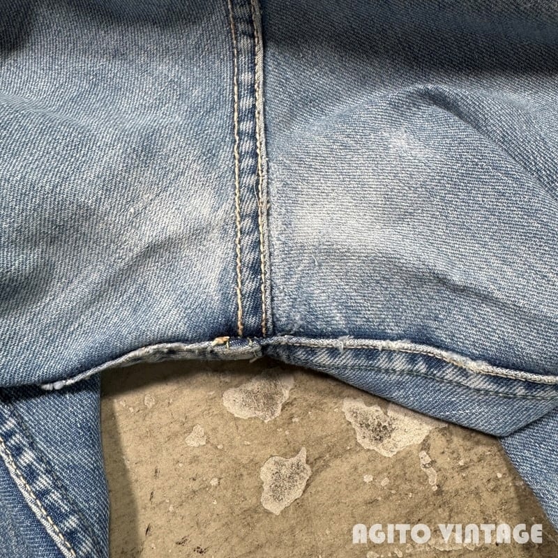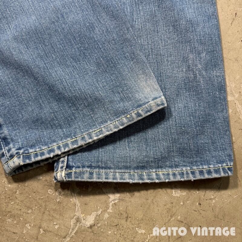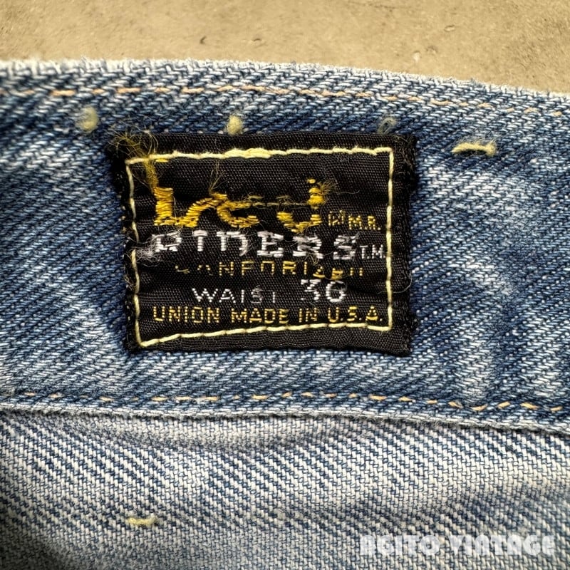 60年代から70年代初頭頃Lee RIDERS 101Z デニムパンツです。サイド黒タグ、MR有り、TALONセミオートマチック、バックポケット当て布あり、サイド脇割り。3割程の色残りですがうっすらとヒゲが入る個体です。ペンキ飛びや薄汚れがありますのでワークな雰囲気も楽しめる1本です。左膝とお尻の付け根には丁寧にリペアが施されています。右腿から膝付近が若干生地が薄くなっています。その他細かな擦れ等ございますが、コンディションは悪くありません。ウエストは表記通りW36インチとゆったりとしたサイズです。夏場に使い易い色味なのでハワイアンシャツ等と合わせてみてはいかがでしょうか。