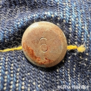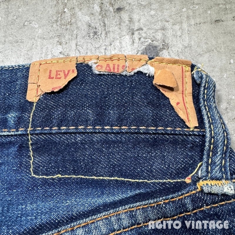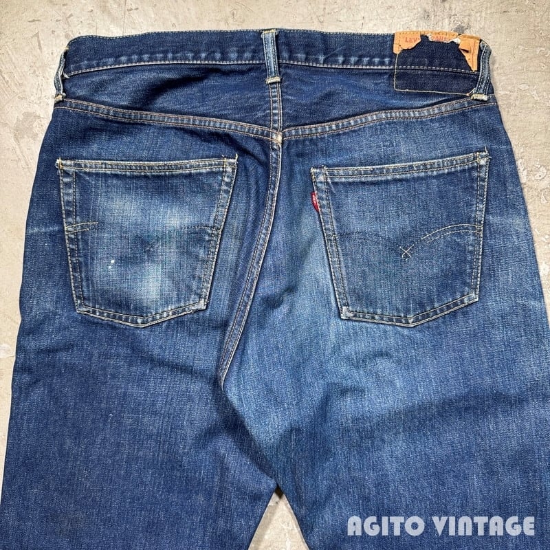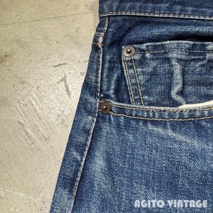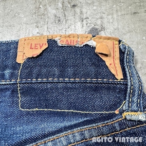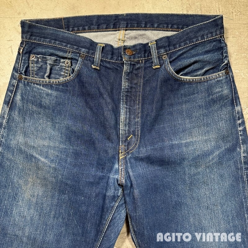 60年代のLEVI'S 505 デニムパンツです。トップボタン裏刻印6(アンダーバー無し)、フロントVステッチ、コインポケットシングル耳付き、42TALON、アウトシームセルヴィッジ、赤タブBig E、紙パッチはウエストシングルで一筆縫い、股のカンヌキはオレンジ、股のコの字折り返しステッチは太目、サイドステッチのピッチは細目、アーキュエイトステッチのピッチは太目でイエロー。ご紹介するこちらは6~7割程の色残りで、濃淡がある1本です。Big Eとしては初期の頃の551ZXXのWネーム期とタイプ物期の両方のディティールが混在しているモデルです。アタリや擦れなど細かな使用感はございます。左バックポケットの角にステッチ切れがございますその他特筆するダメージは無く年代を考慮してもコンディションはかなり良いと思います。ウエストは実寸でW34インチ、レングスはオリジナルです。粗い色味も雰囲気良くヴィンテージデニムらしい個体です。移行期のディティール混在もヴィンテージリーバイスがお好きな方には堪らないポイントでは無いでしょうか。リペアも無く長くご愛用いただけるスペシャルな1本ですのでお探しだった買った方は是非この機会をお見逃しなく!
