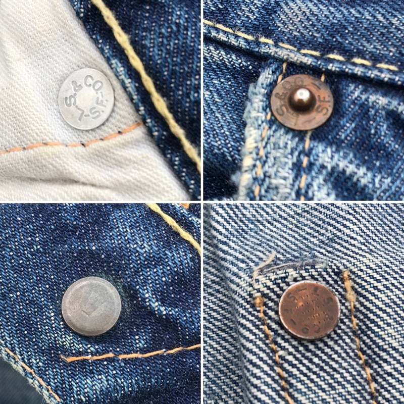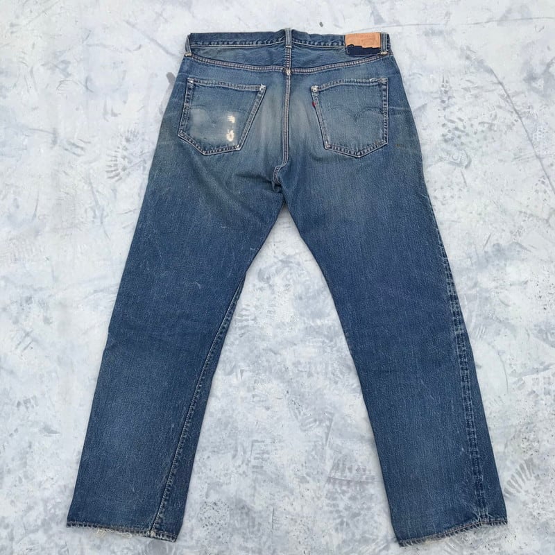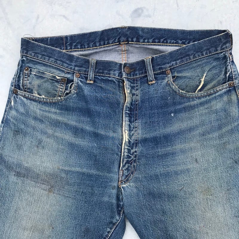 60年代のリーバイス551ZXXです。現在の505の原型モデルとして63年に登場し製造期間もわずか数年という希少なモデルです。67年には隠しリベットが廃止されたので、今回の551ZXXは63年から67年に製造されたと思われます。XXデニムの中ではスリムなシルエットが特徴です。トップボタン刻印W、TALONのセミオートマチックジッパー、フロントVステッチ、リベット裏アルミ、隠しリベットポツポツ刻印、コインポケット裏耳付きシングル、ベルトループオンセット、紙パッチギャラ無し、バックポケット裏シングル、ヨーク左上、赤タブほぼ欠損、両腿裏に補強とリペアが施されています。フロント両ポケット縁にリペアございます。左ハンドポケットに1か所穴が開いてます。なかなか出ない551ZXX、サイズは大き目ですがお探しだった方はおススメです。