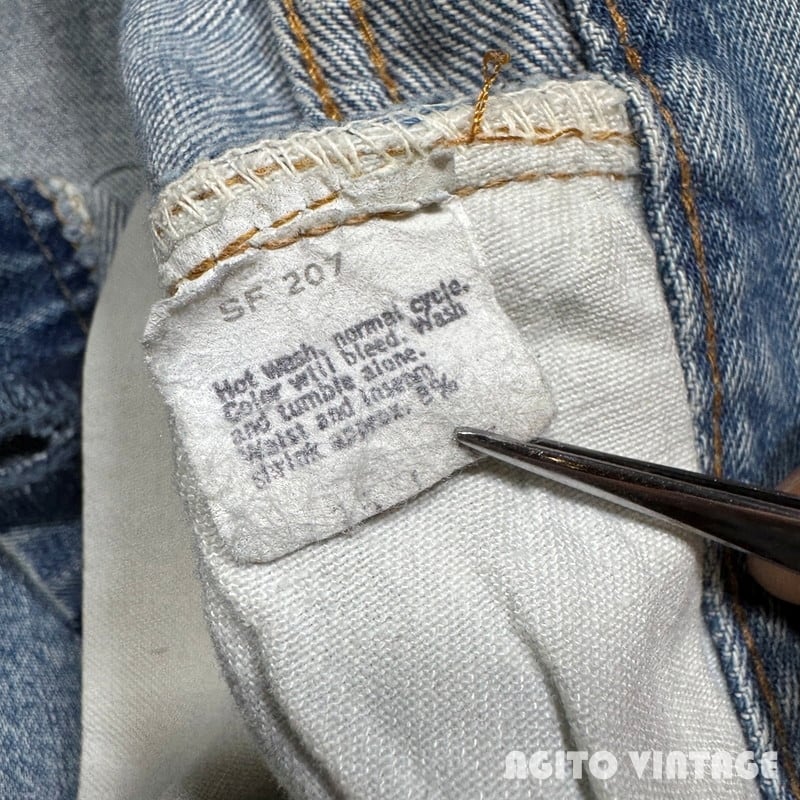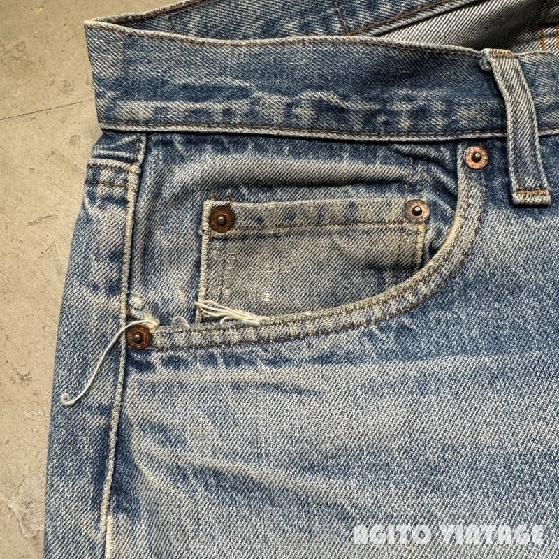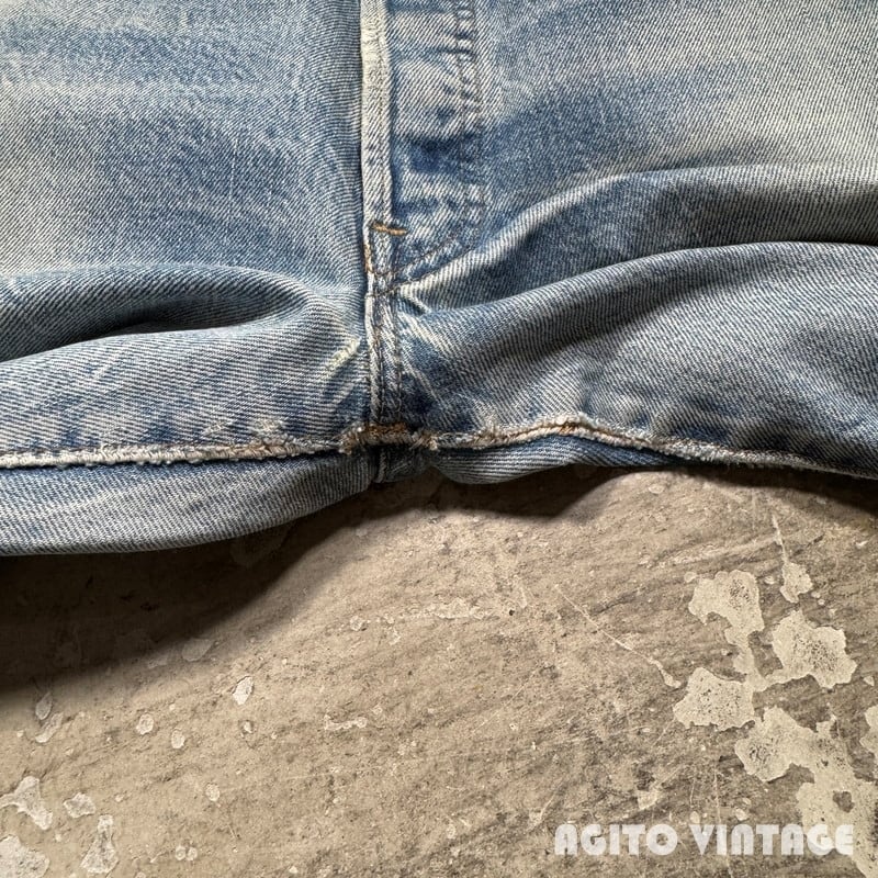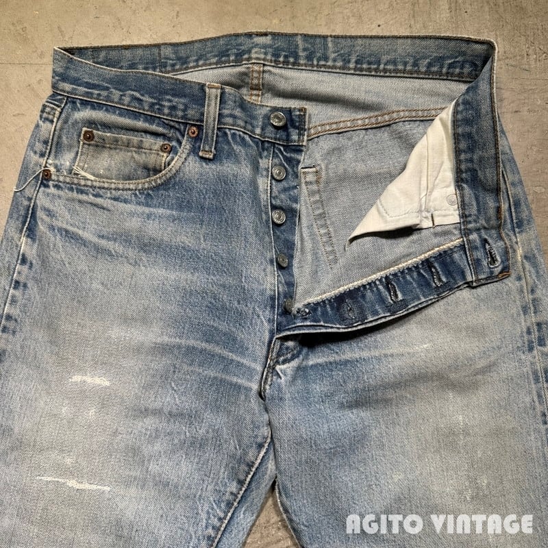 70年代のLevi's 501デニムパンツです。トップボタン裏刻印6、縮率8%、ブランクタブ、バックポケット裏チェーン、セルヴィッジ。内タグの印字がかすれていますが、78年か79年の66後期モデルです。色残りは3割程で全体的に使用感があり、両足とバックポケット下、ボタンホールにリペアがございます。ポケット縁や裾等に擦れによるダメージがございます。色味は薄めですが腿付け根にヒゲが出ており良い雰囲気です。ウエストは実寸でW32インチ程です。レングスはオリジナルのチェーンステッチです。長さも充分にある個体なので高身長の方にもお勧めです。グランジ系などがお好きな方は是非いかがでしょうか。