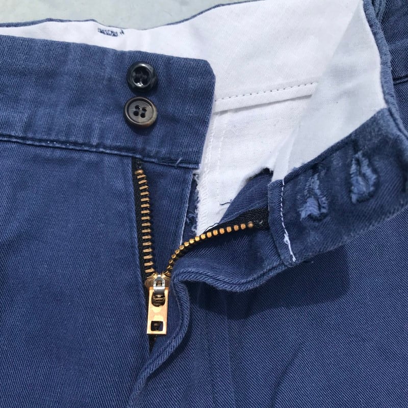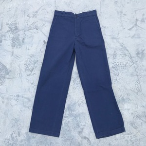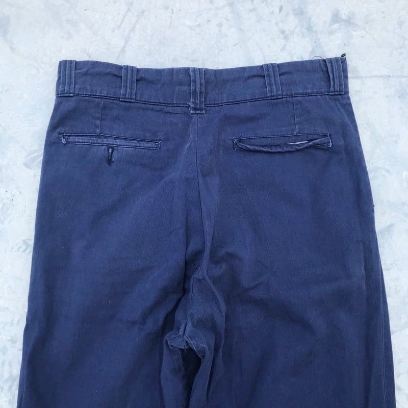 70年代頃のワークウェアブランドTUF NUTコットンワークチノです。フロントはダブルボタンで、TALONのセミオートマチックジッパーを採用しています。下段のボタンは替えられています。股がガゼットクロッチとなっていて動きやすい構造となております。カラーはネイビーで全体に使用感がございます。穿き込めばエイジングも楽しめそうです。バックポケットのボタンは紛失しています。W32くらいのゴールデンサイズです。ワークブランド好きは必見です。